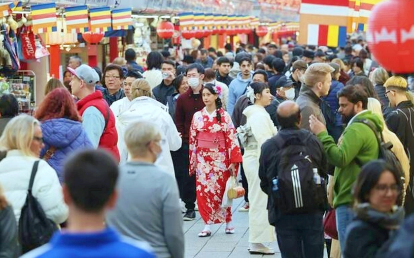 Đám đông khách du lịch nước ngoài trải nghiệm quận Asakusa - nơi được biết đến là cái nôi của nghệ thuật truyền thống từ thời kỳ Edo - ở Thủ đô Tokyo, Nhật Bản ngày 18/11. Ảnh: Kyodo