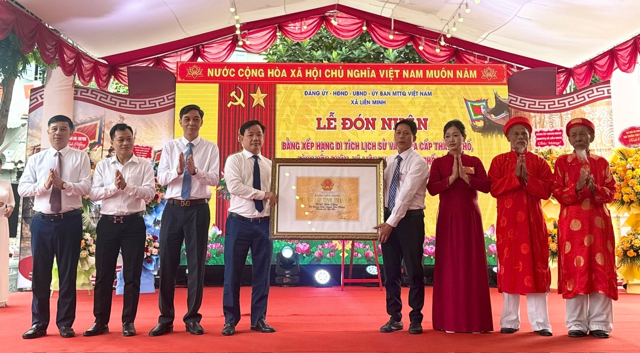 Lãnh đạo xã Liên Minh, lãnh đạo thôn cùng các cụ cao niên đón nhận Bằng xếp hạng di tích cấp thành phố cho đình Yên Châu. Ảnh: Kiều Thoan Thu