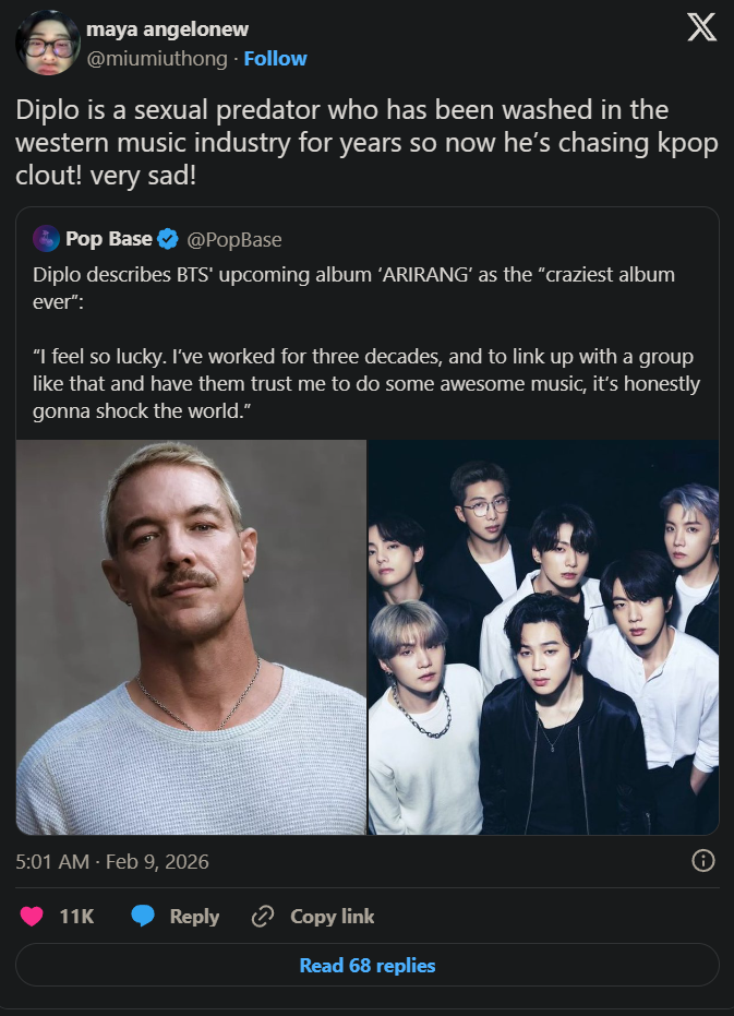 Điểm khiến công chúng phản ứng gay gắt không chỉ nằm ở âm nhạc, mà ở đời tư nhiều tai tiếng của Diplo. Trong quá khứ, nhà sản xuất này từng vướng vào các cáo buộc nghiêm trọng liên quan đến hành vi không phù hợp trong các mối quan hệ cá nhân. Dù những vụ việc đó vẫn gây tranh cãi và chưa đi đến kết luận pháp lý cuối cùng, hình ảnh của anh trong mắt một bộ phận khán giả đã bị ảnh hưởng đáng kể. Chính vì vậy, việc BTS, một nhóm nhạc luôn được xây dựng với hình tượng tích cực và có sức ảnh hưởng lớn, lựa chọn hợp tác với Diplo khiến nhiều người cảm thấy thất vọng.