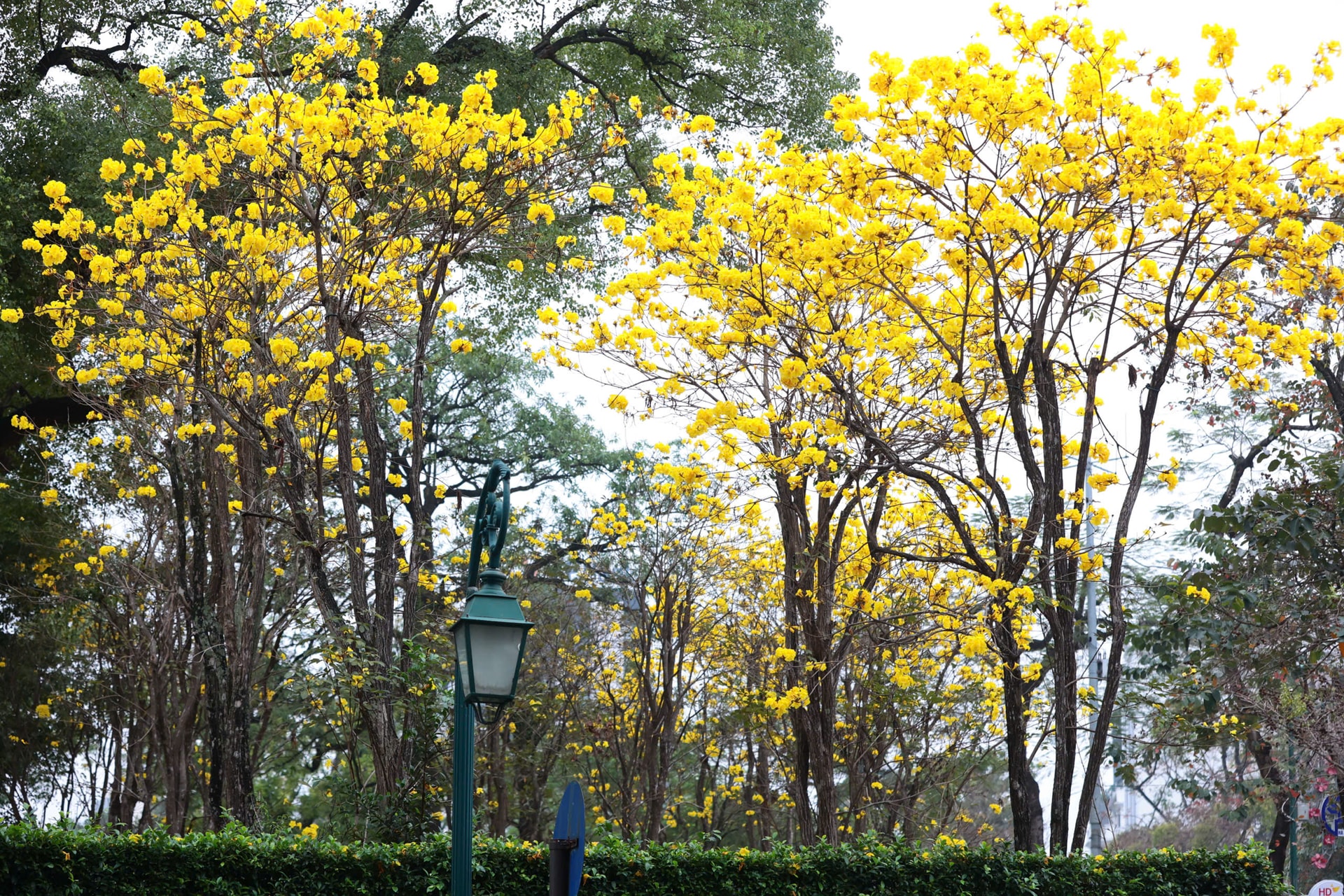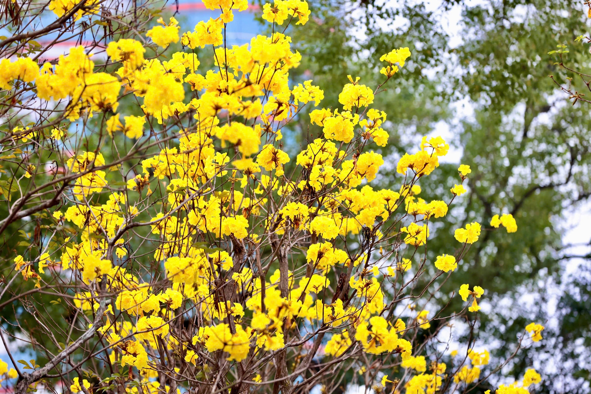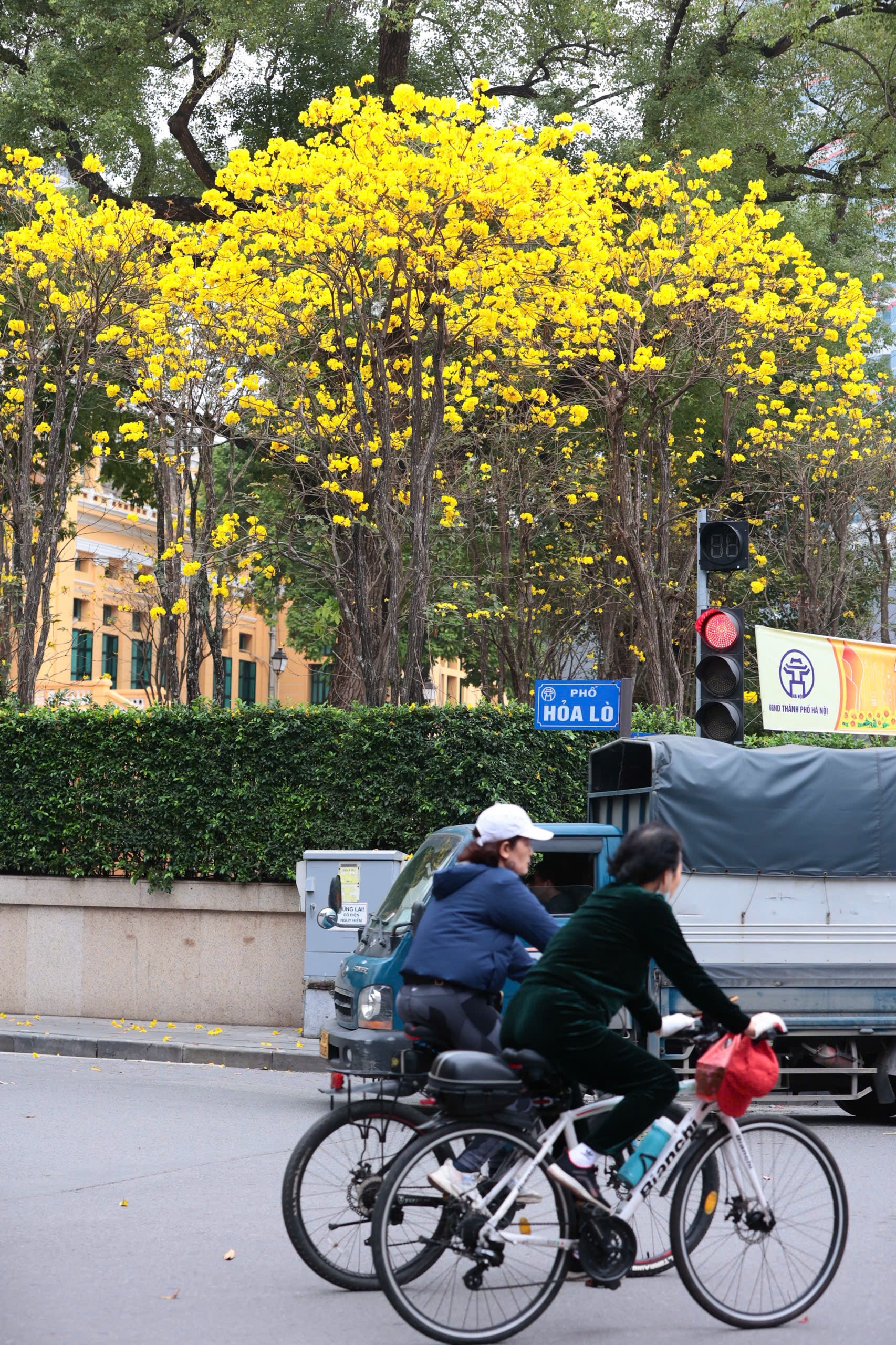 Bên cạnh hoa ban, hoa phong linh cũng bắt đầu nở rộ, nhuộm vàng rực một góc phố Lý Thường Kiệt và khu vực quanh di tích Nhà tù Hỏa Lò, tạo nên khung cảnh tươi sáng giữa lòng Thủ đô. Ảnh: Ngọc Tú