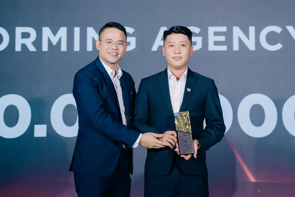 Ông Nguyễn Thanh Việt - Giám đốc Điều hành DKRA Virgo (bên phải) nhận Cúp vinh danh Đơn vị phân phối xuất sắc nhất dự án The Filmore Da Nang từ Chủ đầu tư Filmore Development.