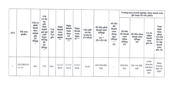 Được biết lô trái phiếu mã DLGBOND14.19 gồm 366 trái phiếu có mệnh giá 1 tỷ đồng/trái phiếu, tổng giá trị phát hành 366 tỷ đồng, được phát hành từ ngày 31/12/2014, kỳ hạn 5 năm.