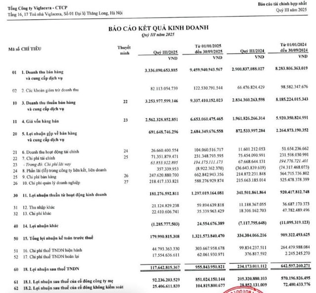Theo báo cáo kinh doanh hợp nhất quý III/2025, Tổng Công ty Viglacera - CTCP (mã ck: VGC) ghi nhận doanh thu thuần đạt gần 3.254 tỷ đồng, tăng 15% so với cùng kỳ.