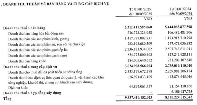 Lũy kế 9 tháng đầu năm, VGC ghi nhận doanh thu thuần hơn 9.337 tỷ đồng, tăng 14% so với cùng kỳ. Trong đó, mảng gạch ốp lát đóng góp chính với 2.737 tỷ đồng, tăng 9%; cho thuê đất khu công nghiệp mang về 2.333 tỷ đồng, tăng 3%; và bất động sản đem lại gần 237 tỷ đồng, gấp 2,2 lần cùng kỳ năm trước.