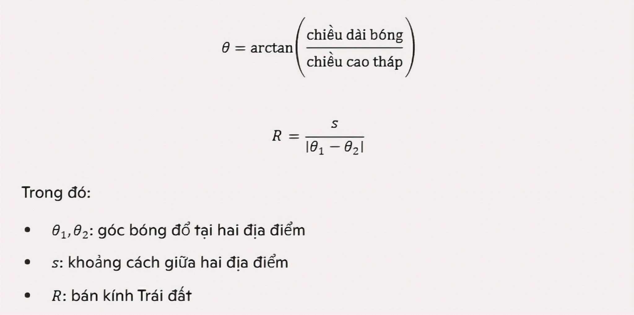 Bước 4: So sánh góc bóng đổ giữa hai nơi, kết hợp với khoảng cách địa lý (dùng Google Maps hoặc đồng hồ đo quãng đường), rồi áp dụng công thức gốc của Eratosthenes hoặc công thức hiện đại của Rhett Allain để tính bán kính Trái đất.