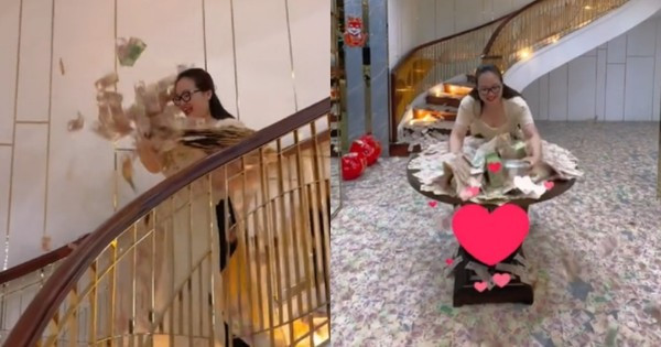 Hoàng Hường từng nhiều lần gây xôn xao với màn khoe tiền như rải tiền khắp nhà, ném tiền từ trên cao xuống dưới đất, xếp tiền thành chồng cao như núi. Ảnh: Internet