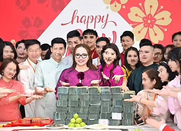 Tết Nguyên đán năm 2025, Hoàng Hường tiếp tục chơi lớn khi bày một bàn toàn cọc tiền dày cộp để lì xì cho nhân viên. Ảnh: Internet