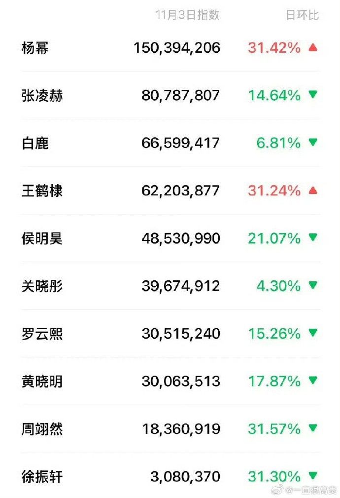 Bảng xếp hạng ngày 3/11 được cho là chỉ tính tương đối do tiệc chính của Đêm hội Tầm nhìn Weibo 2025 diễn ra vào buổi tối. Con số chính xác nhất nên dựa theo chỉ số vào một ngày sau sự kiện (tức ngày 4/11) nhằm bao gồm cả dữ liệu tổng quan nhất về ngôi sao trong và sau đêm hội.