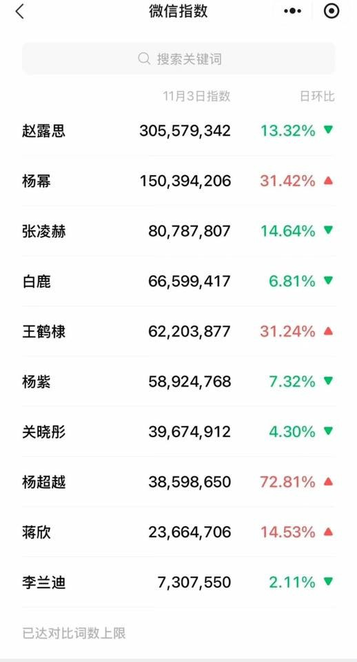 Triệu Lộ Tư dẫn đầu bảng chung chỉ số Wechat ngày 3/11.