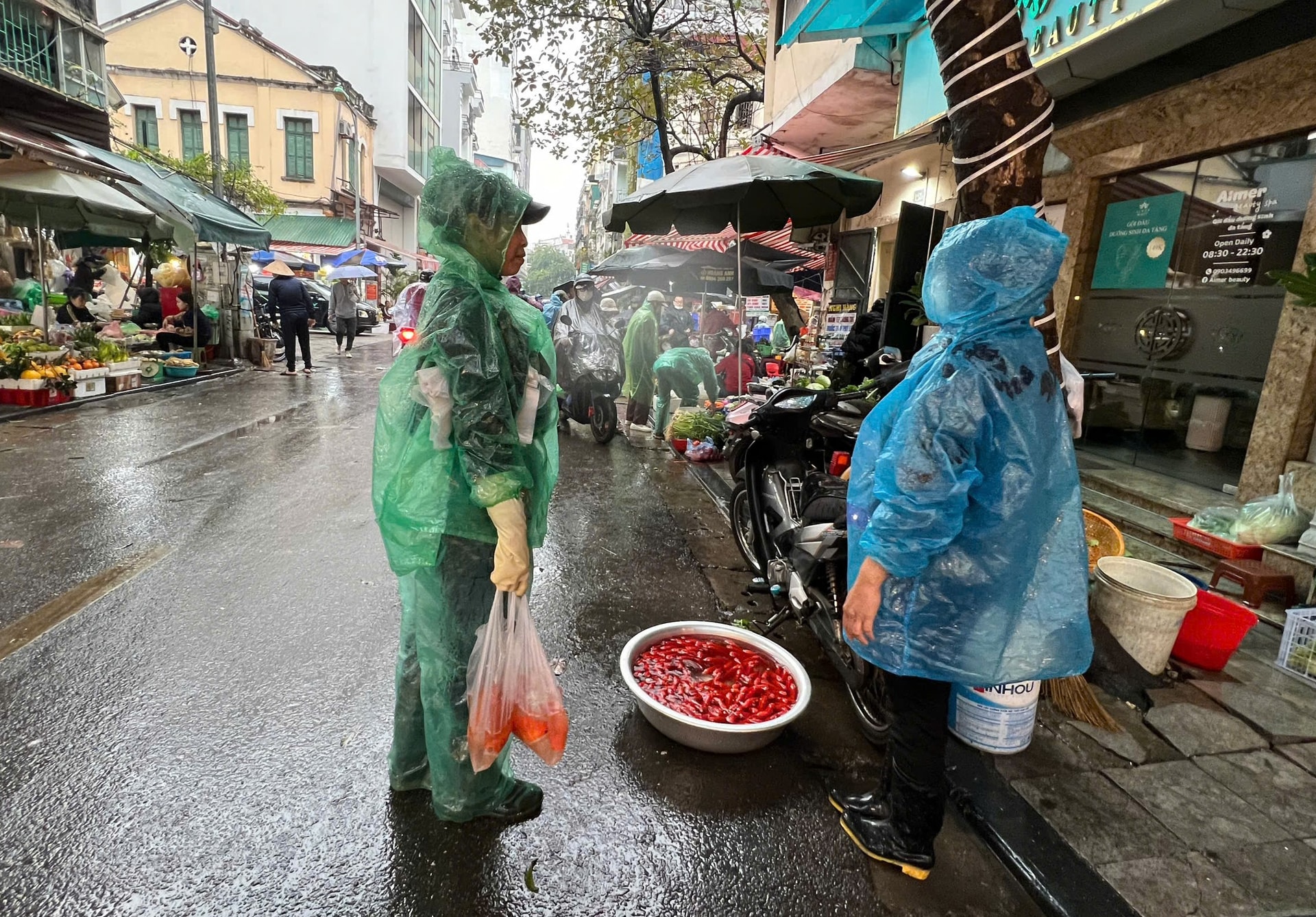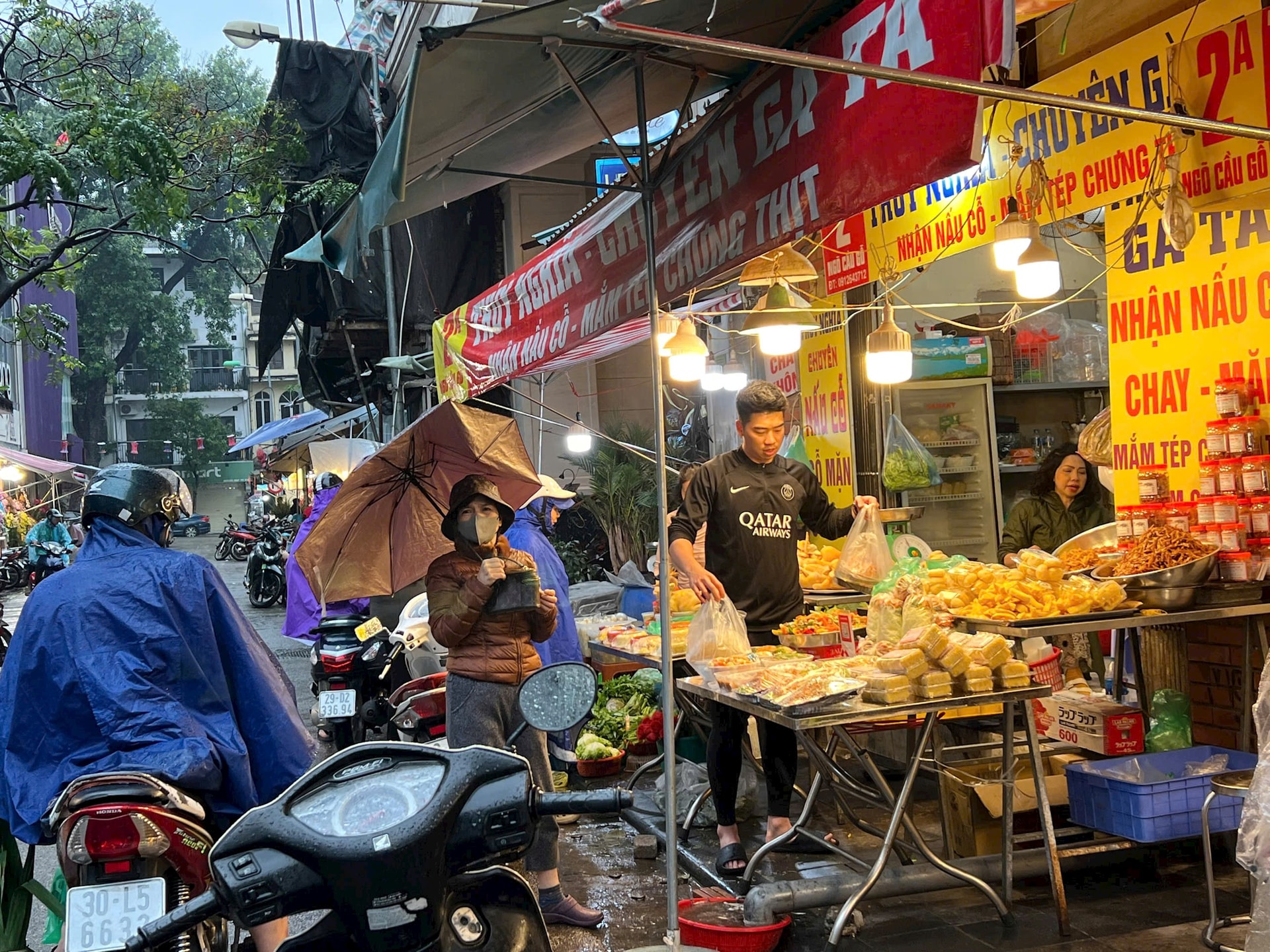 Từ sáng sớm người dân đội mưa đi chợ sắm vật phẩm cúng ông Táo. Ảnh: Lam Giang