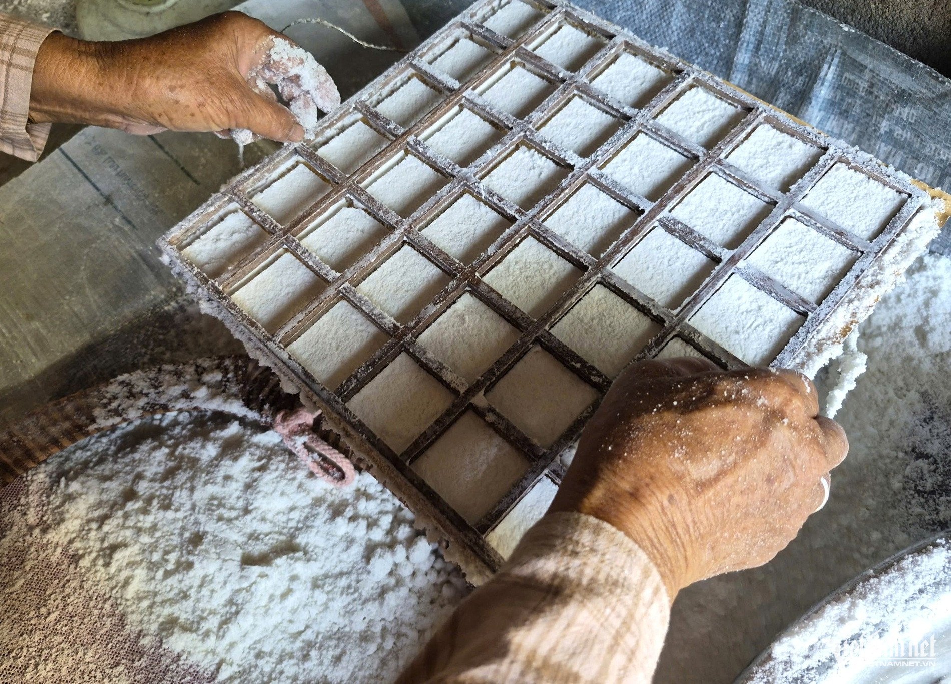 Thợ rây bột gạo vào khuôn với những ô vuông, bên dưới khuôn lót lớp vải thô và định hình mặt bánh bằng một que tre nhỏ