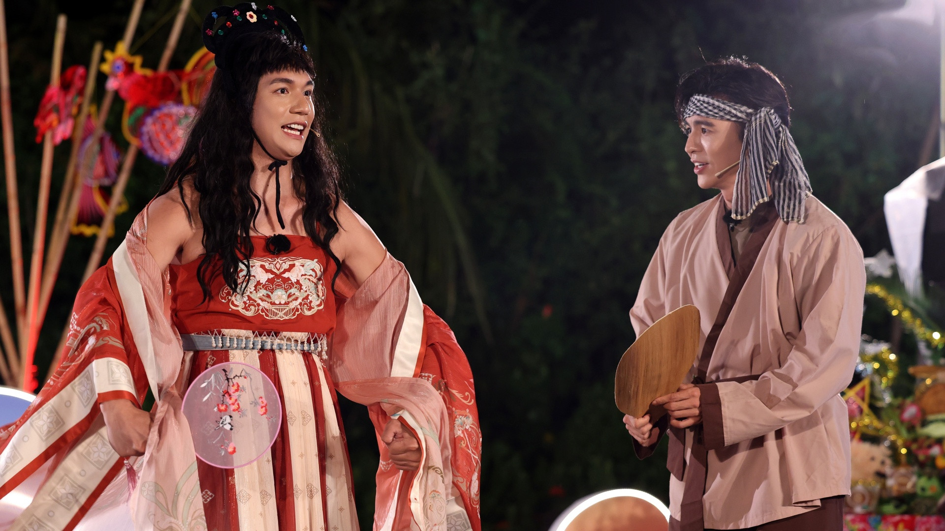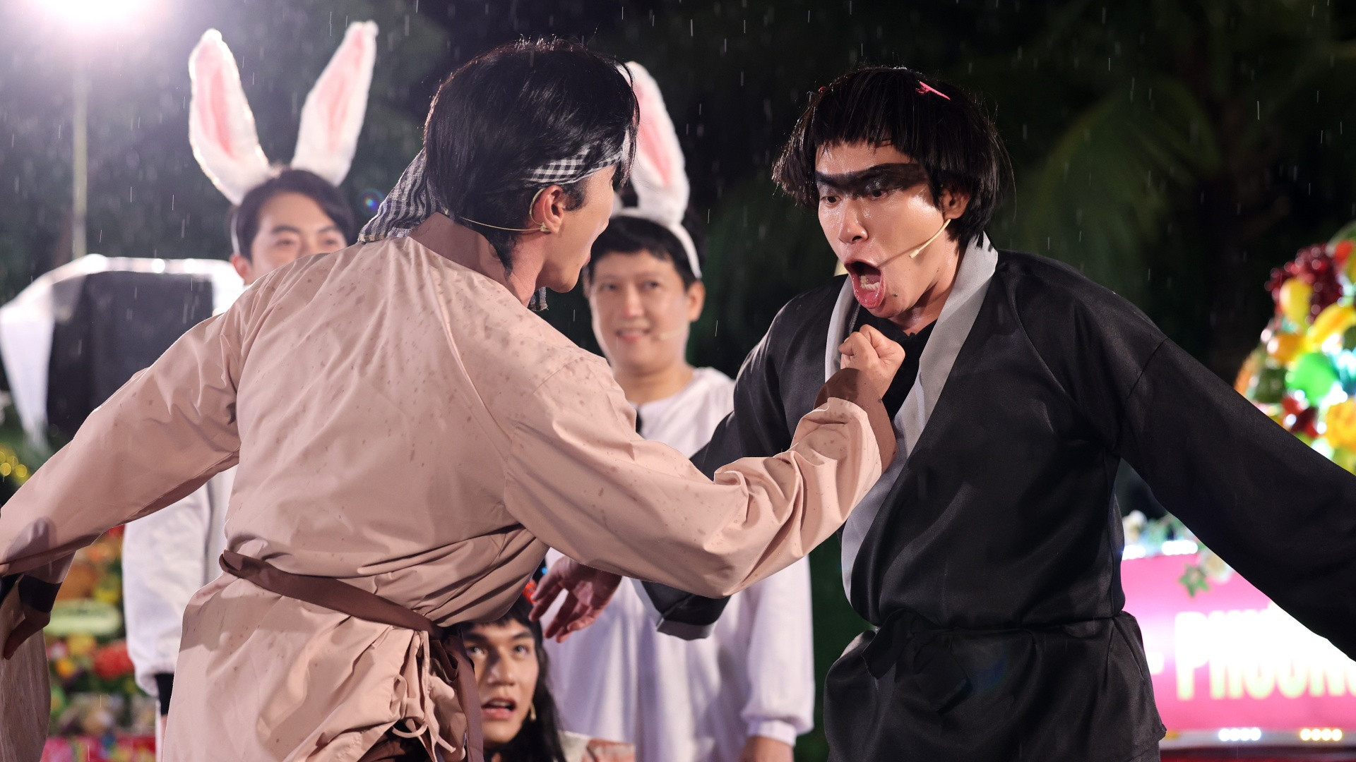 Ngay khi xuất hiện, 'Hằng Nga' Đỗ Nhật Hoàng gây cười vì có nhiều cơ bắp. Xuất thân là vũ công, nam diễn viên thể hiện tài nhào lộn, múa dẻo ấn tượng.