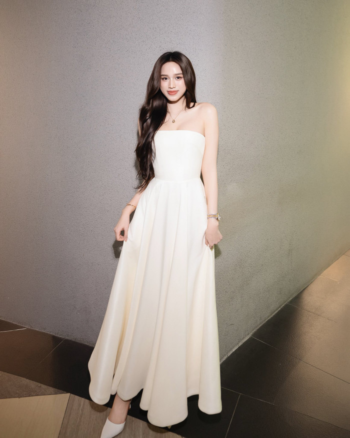 Hoa hậu Đỗ Thị Hà đã khéo léo kết hợp cả hai thiết kế biểu tượng này trong cùng một diện mạo. Nàng hậu lựa chọn đầm trắng dáng dài cúp ngực với phom suông nhẹ, phần thân trên gọn gàng và chân váy rủ mềm, mang lại cảm giác tinh tế, trang nhã. Sự tối giản của trang phục giúp tổng thể trở nên hài hòa, đồng thời tạo “đất diễn” vừa đủ để các món trang sức xa xỉ tỏa sáng.