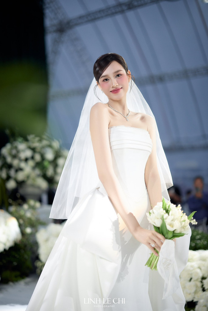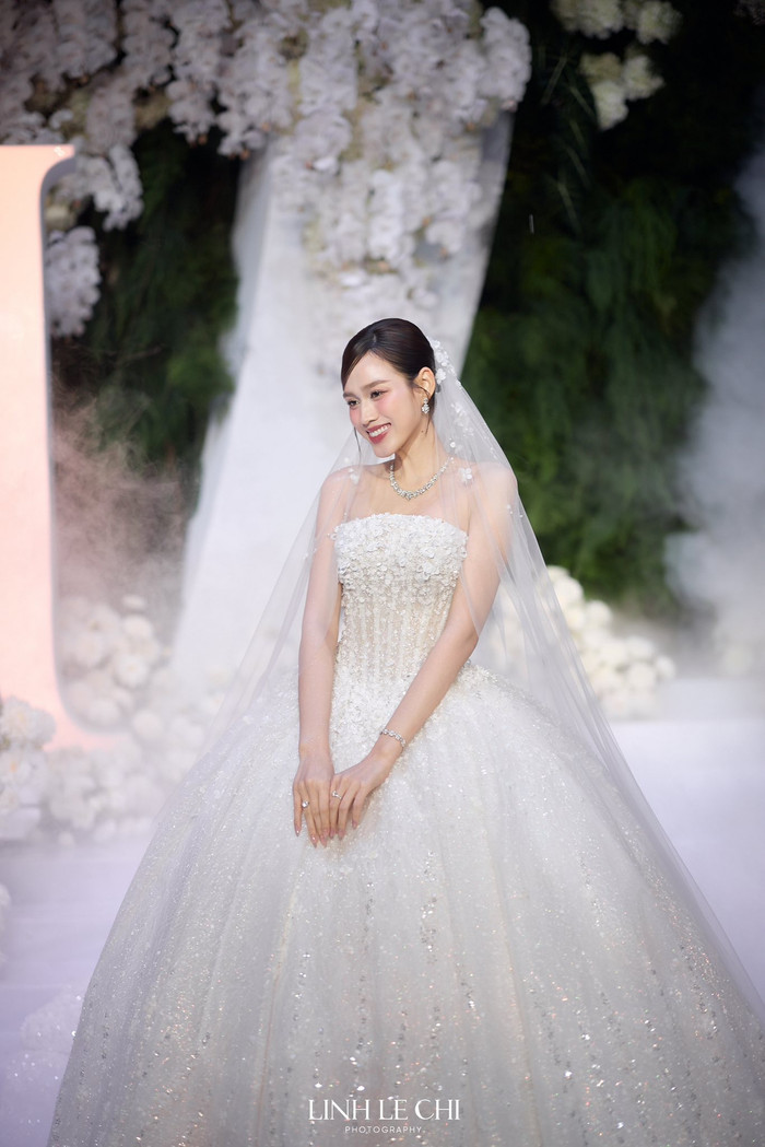 Ở phần lễ chính, hoa hậu lựa chọn mẫu váy công chúa quây ngực với chân váy bồng bềnh. Thiết kế sử dụng metallic tulle, sequin và voan lưới, tạo hiệu ứng phản chiếu ánh sáng dịu nhẹ khi cô dâu di chuyển. Toàn bộ bề mặt được phủ hàng nghìn cụm hoa 3D đính kết thủ công bằng kỹ thuật layered embroidery, mất hơn 2 tháng hoàn thiện.