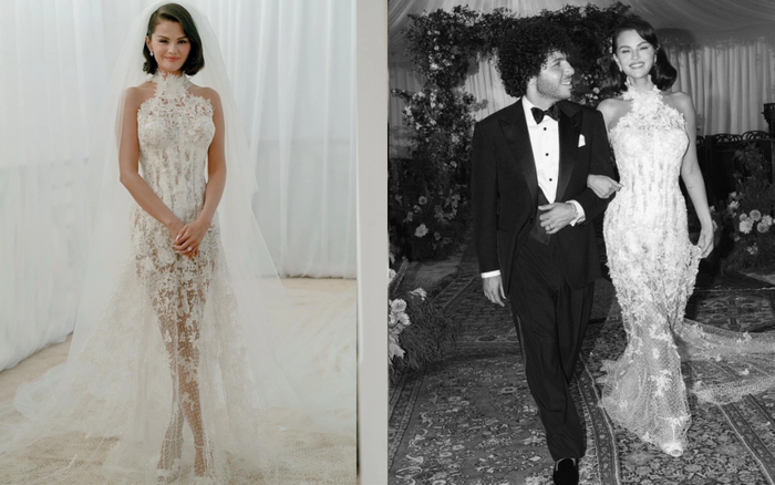 Cụ thể, cả Đỗ Thị Hà và Selena Gomez đều lựa chọn váy cưới chất liệu ren - biểu tượng kinh điển của sự lãng mạn, nữ tính trong thời trang cưới. So với lựa chọn của Selena, hai mẫu váy ren mà Đỗ Thị Hà diện trong hôn lễ cũng mang phong cách tương tự. Ren vừa mang tới sự kín đáo tinh tế, lại vừa sexy vừa đủ - rất hợp hình ảnh nàng hậu dịu dàng nhưng hiện đại của Đỗ Thị Hà. Sự tương đồng này khiến cộng đồng mạng thích thú, gọi đây là “cheap moment đỉnh cao” khi nàng hậu Việt vô tình có khoảnh khắc thời trang trùng vibe với một trong những sao nữ hot nhất Hollywood.
