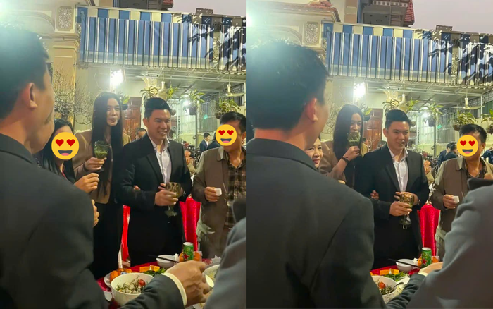 Mới đây, khán giả đã chuyền tay nhau đoạn clip ghi lại khoảnh khắc Đỗ Thị Hà và chồng cùng nhau nâng ly mời mâm tiệc trong không gian thoáng đãng, ấm cúng. Trong hình ảnh lan truyền, cặp đôi diện trang phục giản dị và thể hiện sự thân thiện, gần gũi khi chủ động mời rượu những người có mặt.