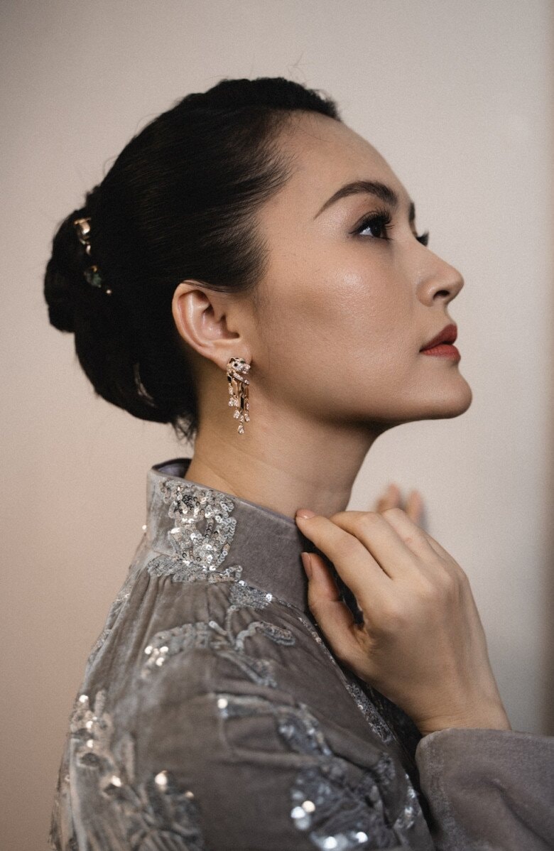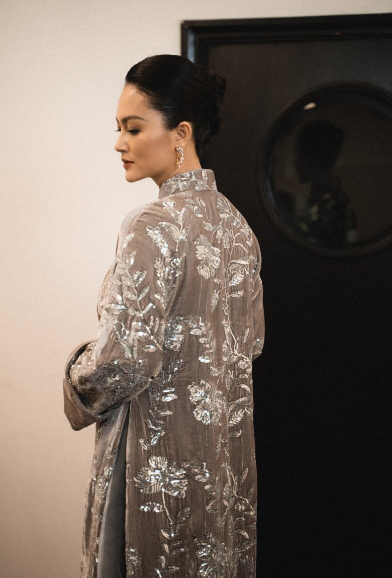 Bản thân Đỗ Thị Hải Yến gây ấn tượng mạnh với nhan sắc mặn mà, sang trọng. Chị diện một bộ áo dài với hoa văn ánh kim tinh xảo, kết hợp cùng đôi bông tai nổi bật. Vẻ đẹp đậm chất điện ảnh và phong thái điềm tĩnh đã tạo nên khí chất riêng biệt, khẳng định đẳng cấp của một minh tinh.