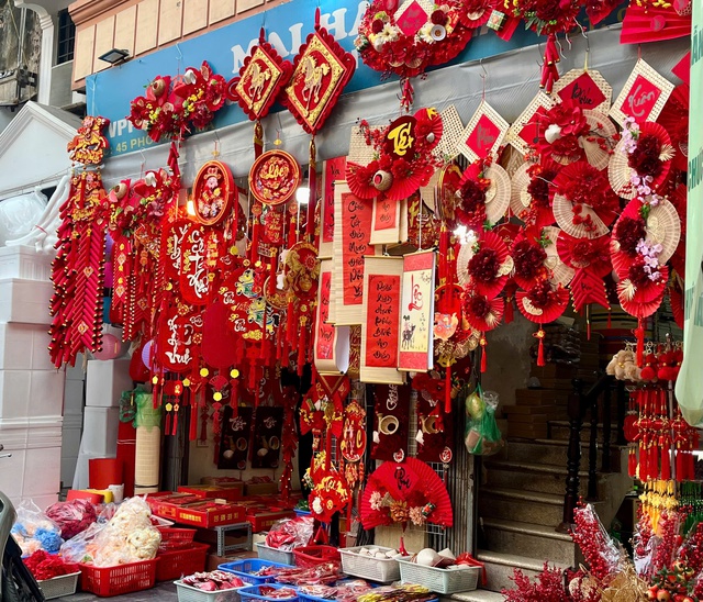 Trên các sạp hàng, những chiếc đèn lồng đỏ, câu đối, bao lì xì, dây treo chữ Phúc – Lộc – Thọ, quạt giấy trang trí, phụ kiện treo cửa, linh vật năm mới… được sắp xếp dày đặc.