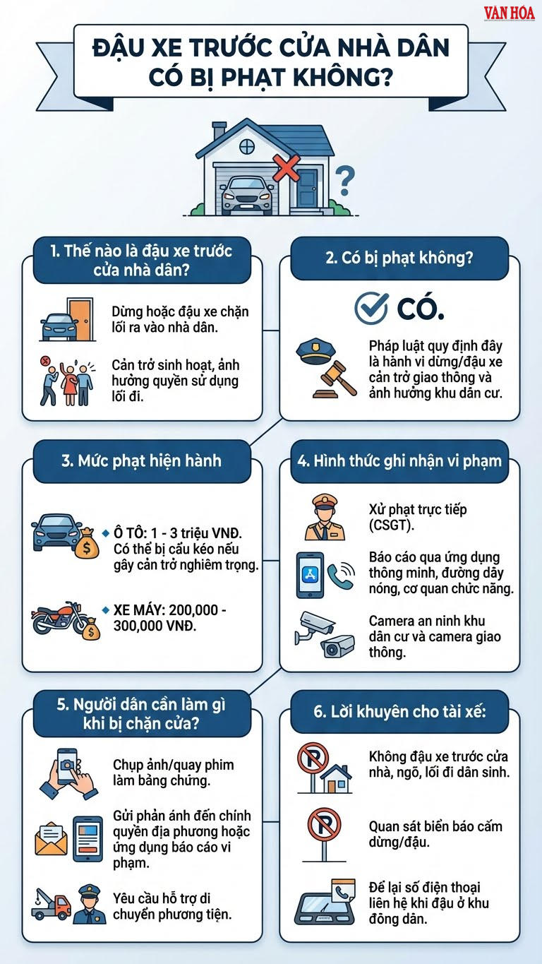 Đỗ xe chắn cửa nhà dân không bị phạt nếu không vi phạm quy định dừng, đỗ xe, nhưng vẫn tiềm ẩn nguy cơ bị xử lý khi gây cản trở giao thông hoặc vi phạm biển báo. Đây cũng là hành vi có thể dẫn tới mâu thuẫn, tranh chấp và xung đột trong cộng đồng.