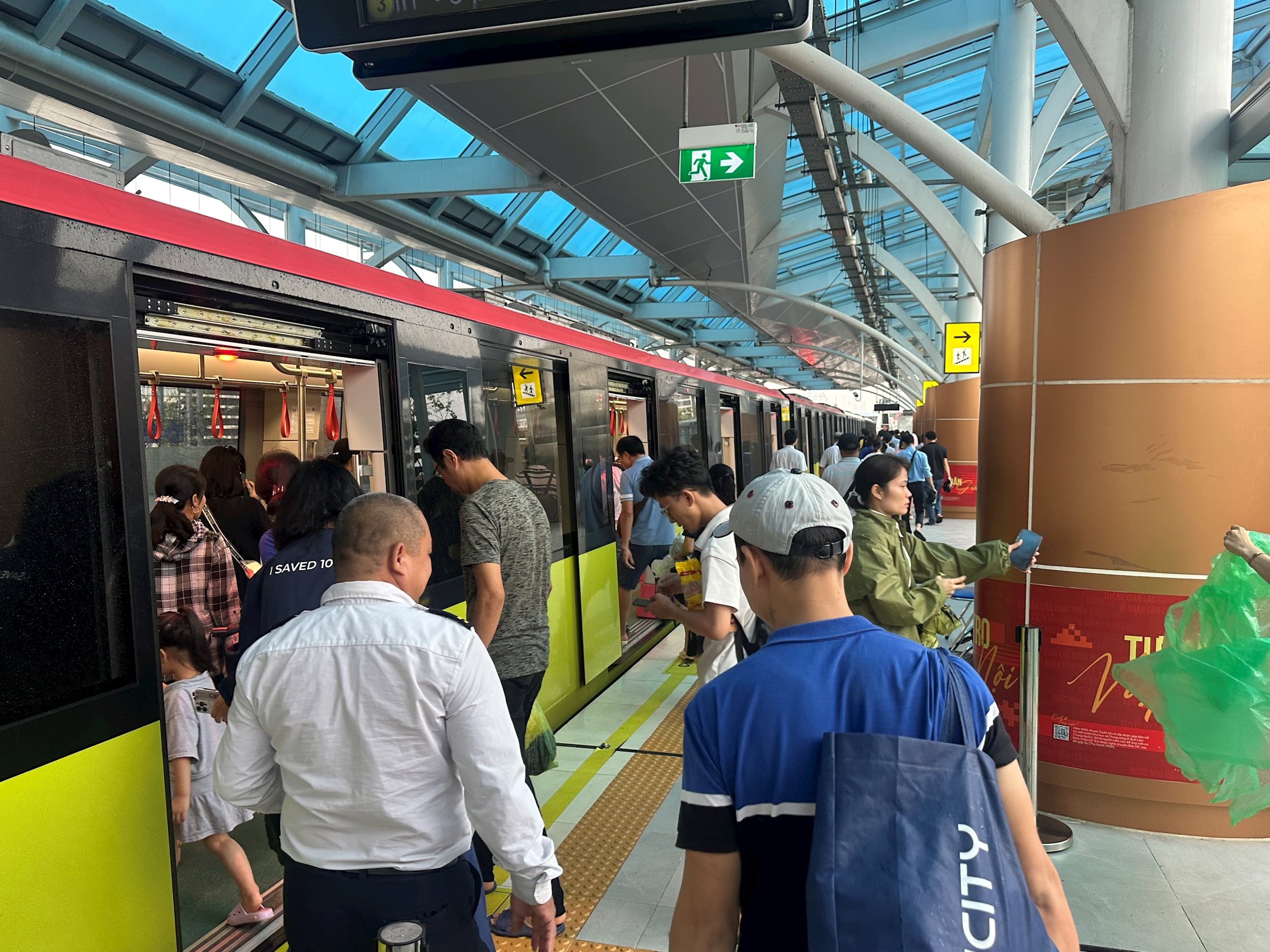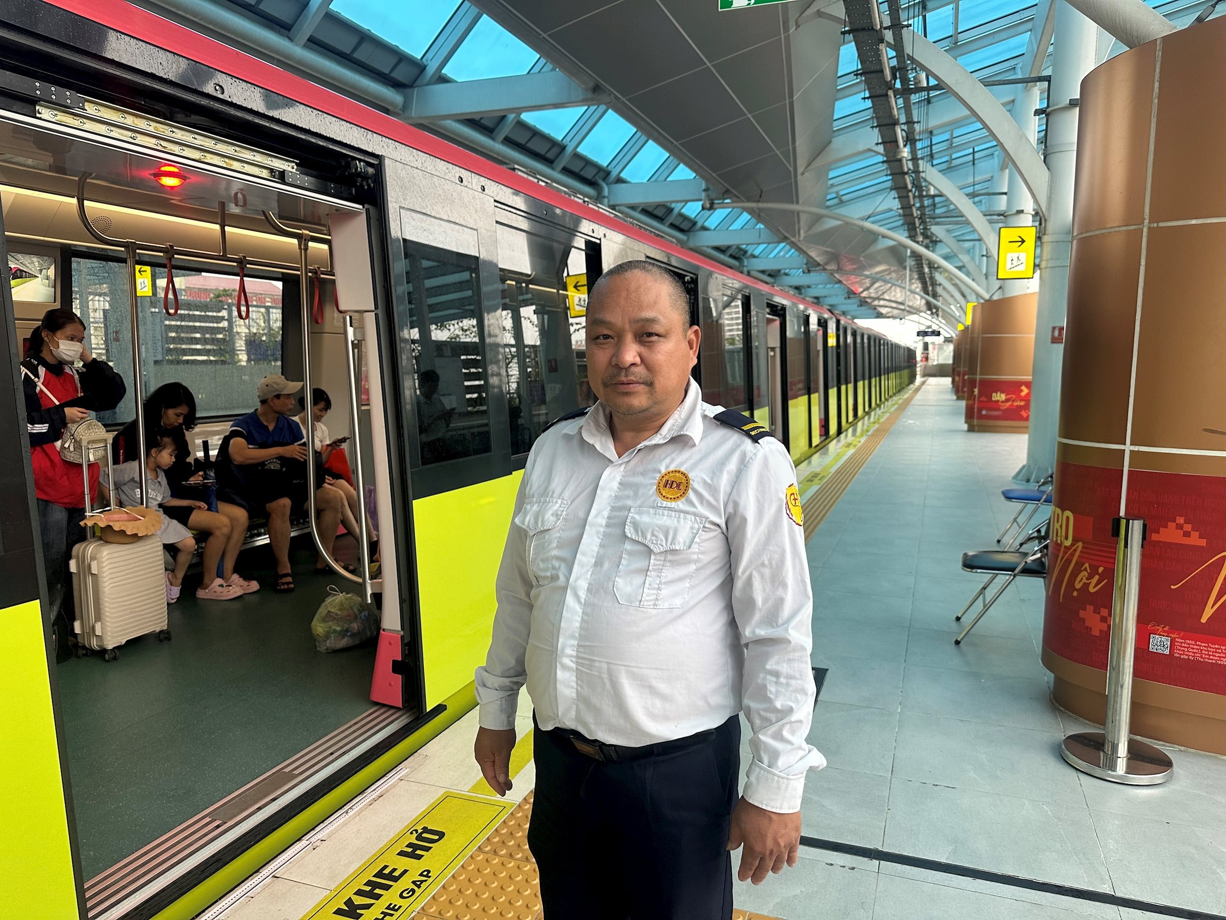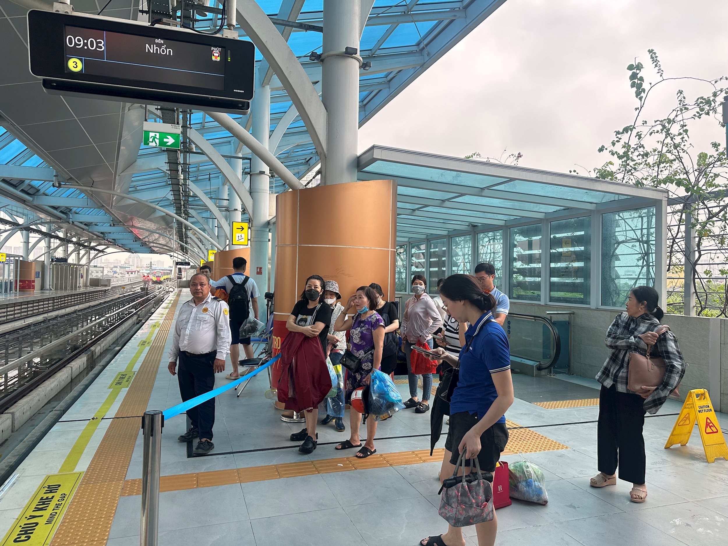 8h sáng, tại ga Cầu Giấy, hành khách xếp hàng chờ tàu dài kín sảnh. Ông Nguyễn Viết Hải – nhân viên bảo vệ trực ca cho biết lượng khách sáng nay tăng gấp 2–3 lần so với thường lệ.