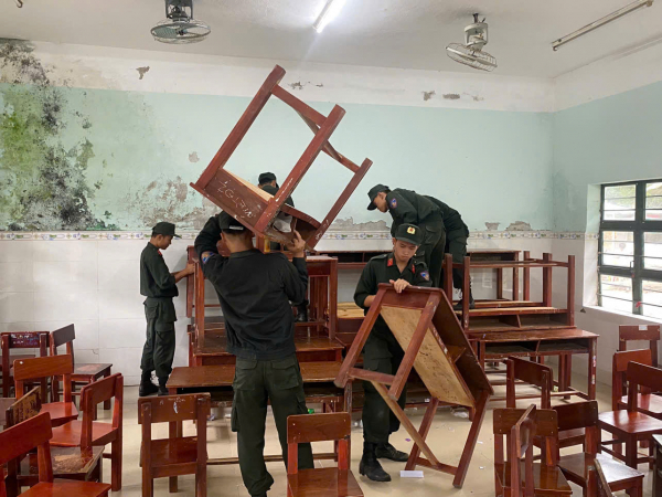 Cán bộ, chiến sĩ Đoàn CSĐN số 3 giúp Trường THCS Phạm Văn Đồng kê cao bàn ghế, di dời tài sản trong các lớp học trước giờ bão số 12 gây ảnh hưởng TP Đà Nẵng.