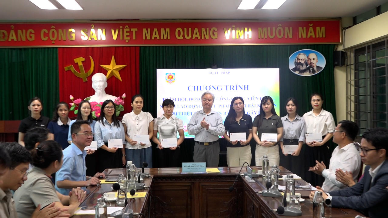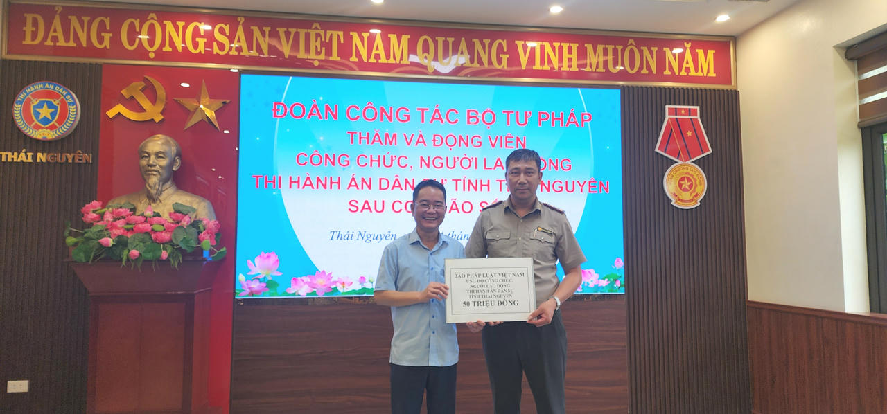 Lãnh đạo Bộ Tư pháp tặng quà hỗ trợ cán bộ, người lao động Sở Tư pháp tỉnh Thái Nguyên thiệt hại tài sản do bão số 11 gây ra.