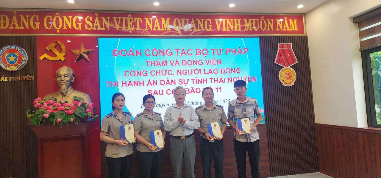 Tại trụ sở THADS tỉnh Thái Nguyên, ông Bùi Huy Toàn, Trưởng THADS tỉnh Thái Nguyên báo cáo nhanh về tình hình thiệt hại do ảnh hưởng của bão số 11, nhiều cơ quan thuộc Cục Thi hành án dân sự (THADS) tỉnh Thái Nguyên bị ngập sâu trong nước, gây thiệt hại nặng nề về tài sản, hồ sơ và thiết bị làm việc, với tổng giá trị ước tính hơn 2 tỉ đồng.
