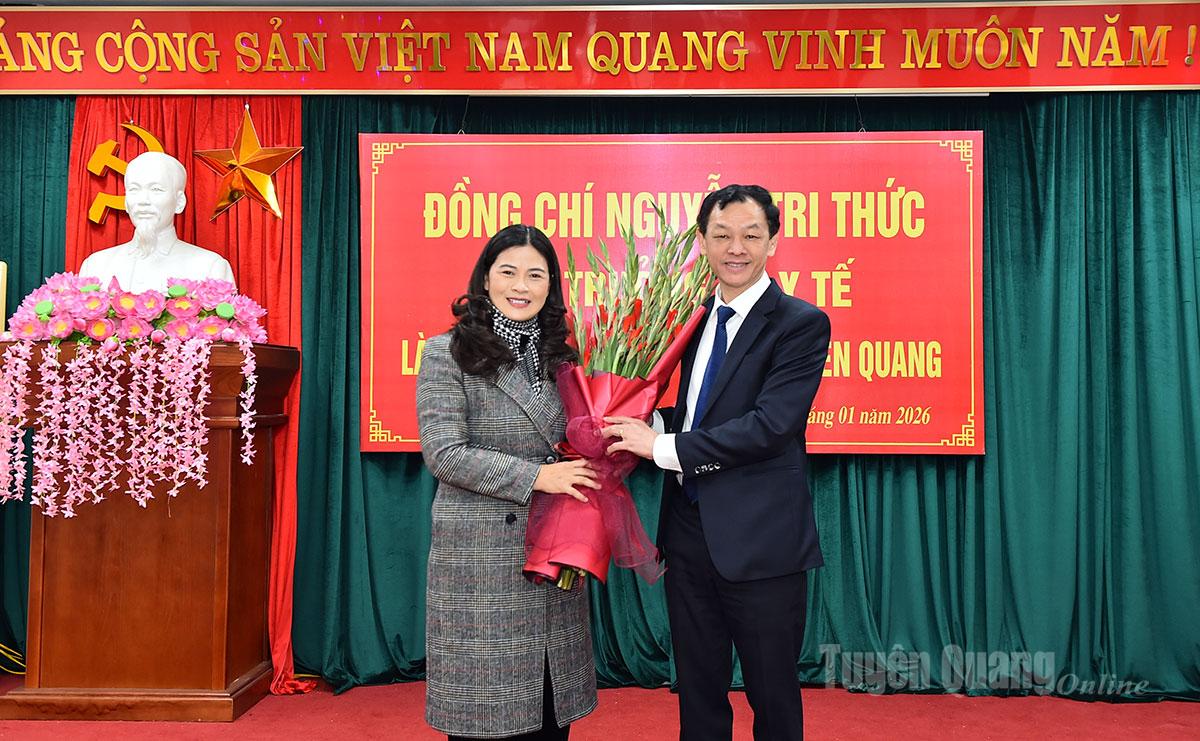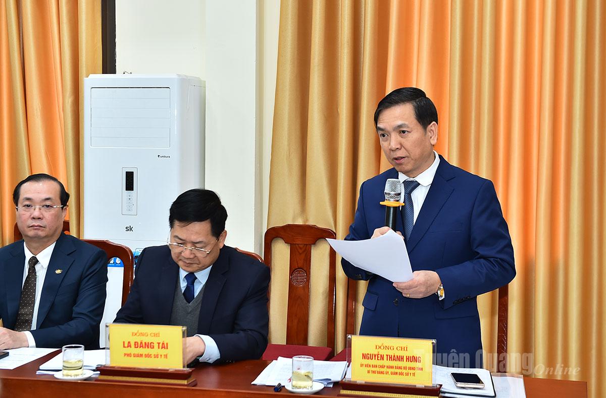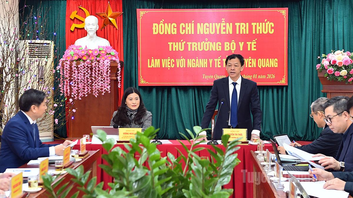Phát biểu tại buổi làm việc, Thứ trưởng Bộ Y tế Nguyễn Tri Thức bày tỏ sự vui mừng và xúc động khi lần đầu tiên đến thăm, làm việc với tỉnh Tuyên Quang, quê hương cách mạng. Thứ trưởng ghi nhận và đánh giá cao những nỗ lực, cố gắng của ngành Y tế tỉnh trong bối cảnh còn nhiều khó khăn, đặc biệt là việc duy trì ổn định hệ thống y tế sau sáp nhập và bảo đảm quyền lợi chăm sóc sức khỏe cho Nhân dân.