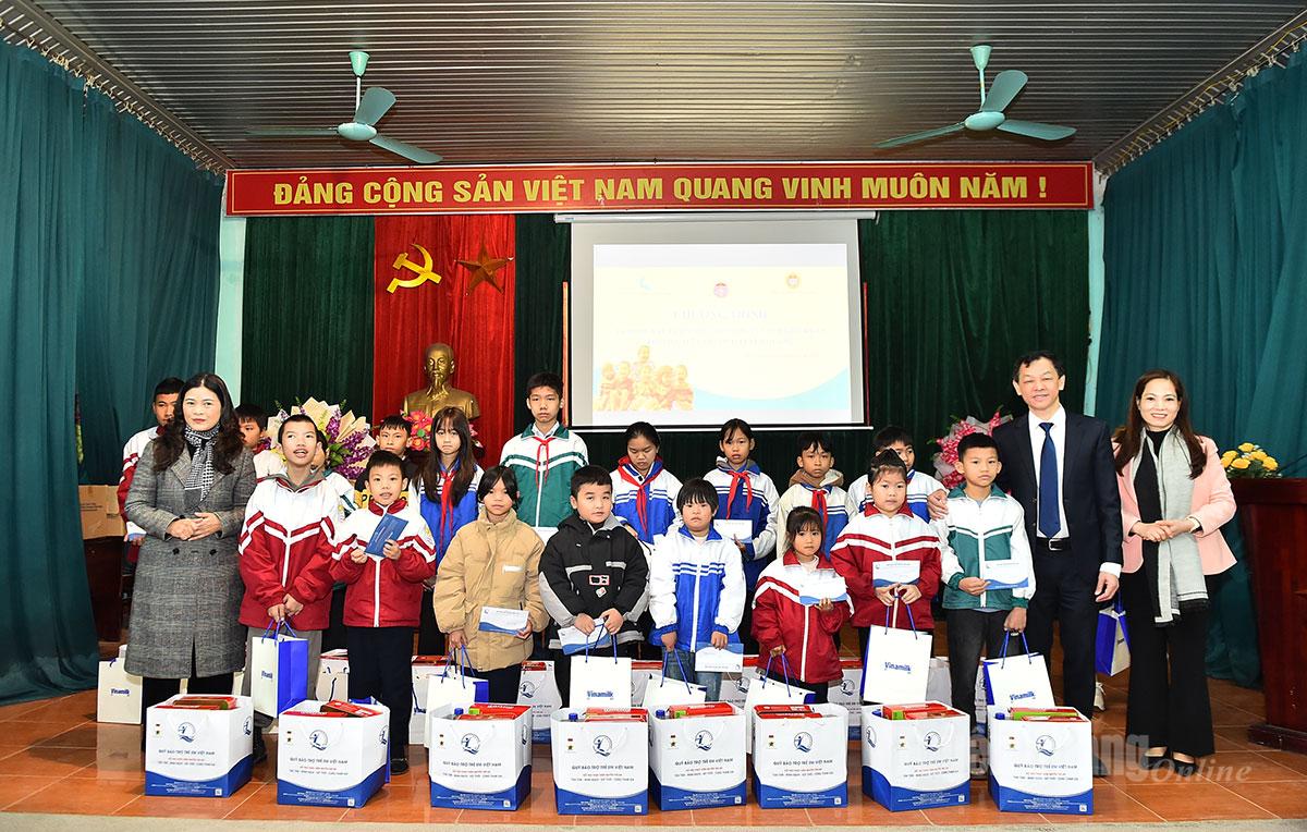 Các đồng chí lãnh đạo Bộ Y tế và lãnh đạo tỉnh tặng quà cho trẻ em có hoàn cảnh khó khăn phường Mỹ Lâm.