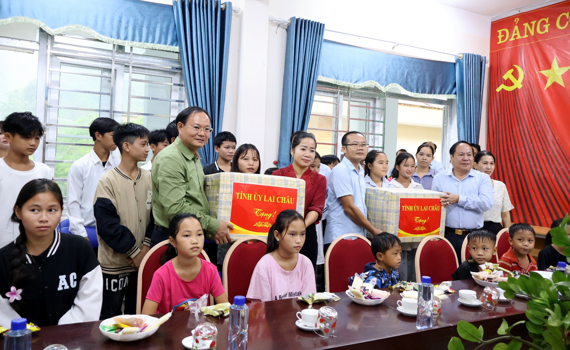 Đồng chí Lê Minh Ngân - Bí thư Tỉnh ủy và đồng chí Tống Thanh Hải - Ủy viên Ban Thường vụ Tỉnh ủy, Phó Chủ tịch Thường trực UBND tỉnh tặng quà trung thu cho học sinh Trường Phổ thông Dân tộc bán trú Tiểu học và THCS Hua Bum.