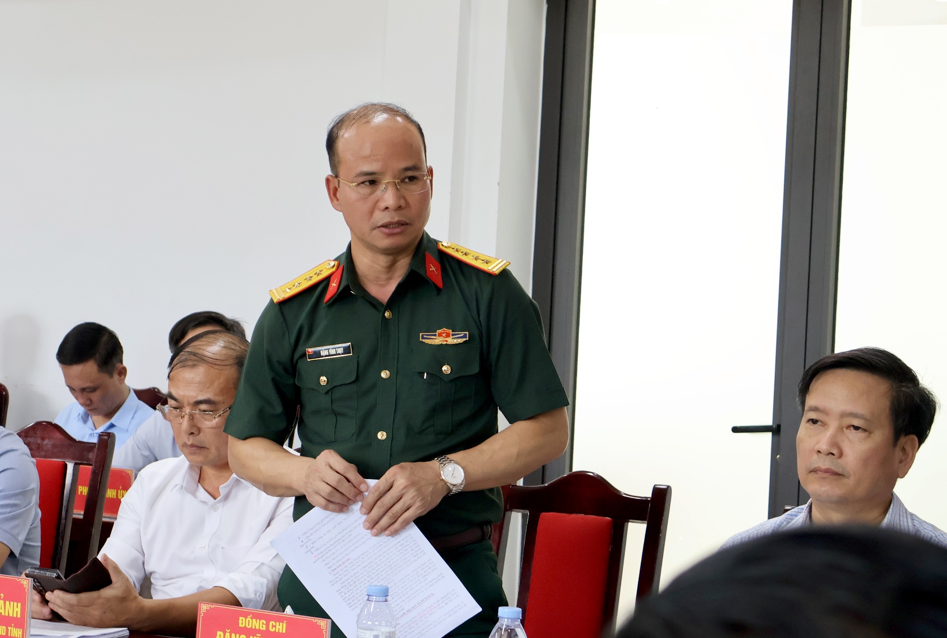 Đại tá Đặng Vĩnh Thụy - Ủy viên Ban Thường vụ Tỉnh ủy, Chỉ huy trưởng Bộ Chỉ huy Quân sự tỉnh phát biểu tại buổi làm việc.
