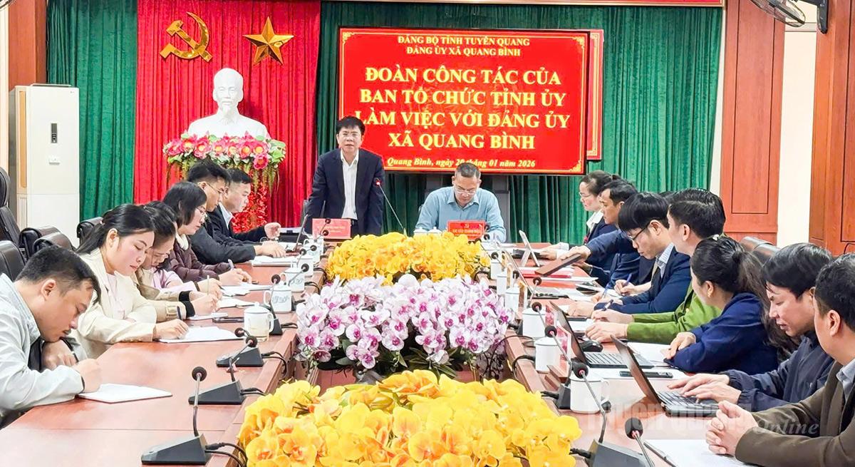 Tại buổi làm việc, Đảng ủy và các bộ phận chuyên môn của xã Quang Bình đã báo cáo kết quả công tác xây dựng Đảng, trong đó tập trung làm rõ việc quán triệt, triển khai thực hiện các nghị quyết, chỉ thị của Trung ương, của Tỉnh ủy; công tác sắp xếp, kiện toàn tổ chức bộ máy của hệ thống chính trị ở cơ sở theo hướng tinh gọn, hoạt động hiệu lực, hiệu quả; công tác quản lý, đánh giá, quy hoạch, đào tạo, bồi dưỡng và sắp xếp vị trí việc làm cho cán bộ, đảng viên.