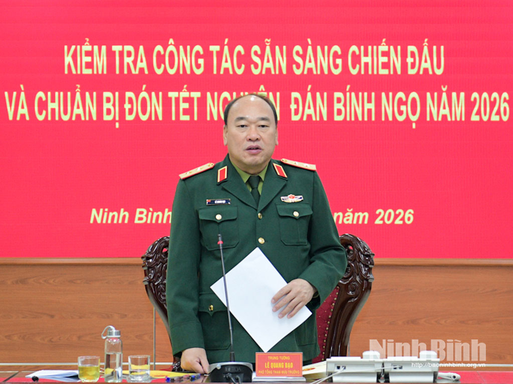 Phát biểu tại buổi làm việc, đồng chí Trung tướng Lê Quang Đạo, Phó Tổng Tham mưu trưởng Quân đội Nhân dân Việt Nam ghi nhận, biểu dương tinh thần chủ động, trách nhiệm của Bộ CHQS tỉnh và Ban Chỉ huy BĐBP tỉnh Ninh Bình trong quán triệt, triển khai nhiệm vụ quốc phòng, quân sự địa phương, biên phòng năm 2025 và công tác chuẩn bị sẵn sàng chiến đấu, đón Tết Nguyên đán Bính Ngọ 2026. Đồng chí Phó Tổng Tham mưu trưởng Quân đội nhân dân Việt Nam nhấn mạnh: Thời điểm trước, trong và sau Tết là thời điểm tiềm ẩn nhiều yếu tố phức tạp về quốc phòng, an ninh. Vì vậy, các cơ quan, đơn vị cần tiếp tục quán triệt sâu sắc chỉ thị, mệnh lệnh của cấp trên; duy trì nghiêm các chế độ trực; nắm chắc tình hình địa bàn, chủ động tham mưu cho cấp ủy, chính quyền địa phương các chủ trương, biện pháp bảo đảm an ninh chính trị, trật tự an toàn xã hội, không để xảy ra bị động, bất ngờ trong mọi tình huống. Đồng chí yêu cầu lực lượng vũ trang tỉnh tập trung làm tốt công tác quản lý bộ đội, chấp hành nghiêm kỷ luật, pháp luật, bảo đảm tuyệt đối an toàn về người, vũ khí trang bị, doanh trại, kho tàng, thực hiện tốt chính sách hậu phương quân đội, chăm lo chu đáo đời sống vật chất, tinh thần cho cán bộ, chiến sĩ, tổ chức đón Tết vui tươi, lành mạnh, tiết kiệm, an toàn, sẵn sàng cơ động khi có lệnh.
