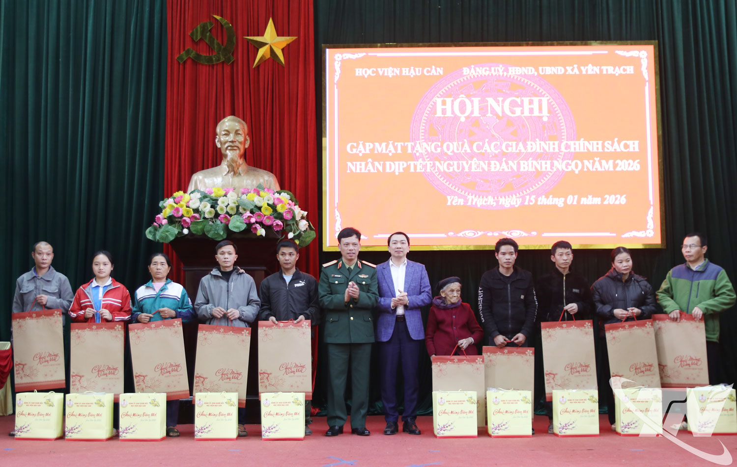 Thiếu tướng Lê Thành Long, Phó Chính ủy Học viện Hậu cần, và lãnh đạo xã Yên Trạch tặng quà Tết cho các hộ chính sách.