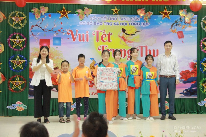 Đại diện Công ty TNHH Bạch Dương trao quà trung thu cho các em tại Cơ sở Bảo trợ Xã hội Tổng hợp tỉnh
