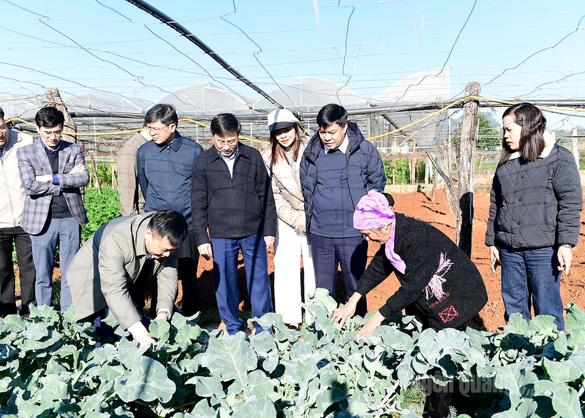 Đồng chí Hoàng Gia Long, Ủy viên Ban Thường vụ Tỉnh ủy, Phó Chủ tịch UBND tỉnh và đoàn công tác tham quan một số mô hình trồng rau an toàn trên địa bàn phường Mộc Châu.