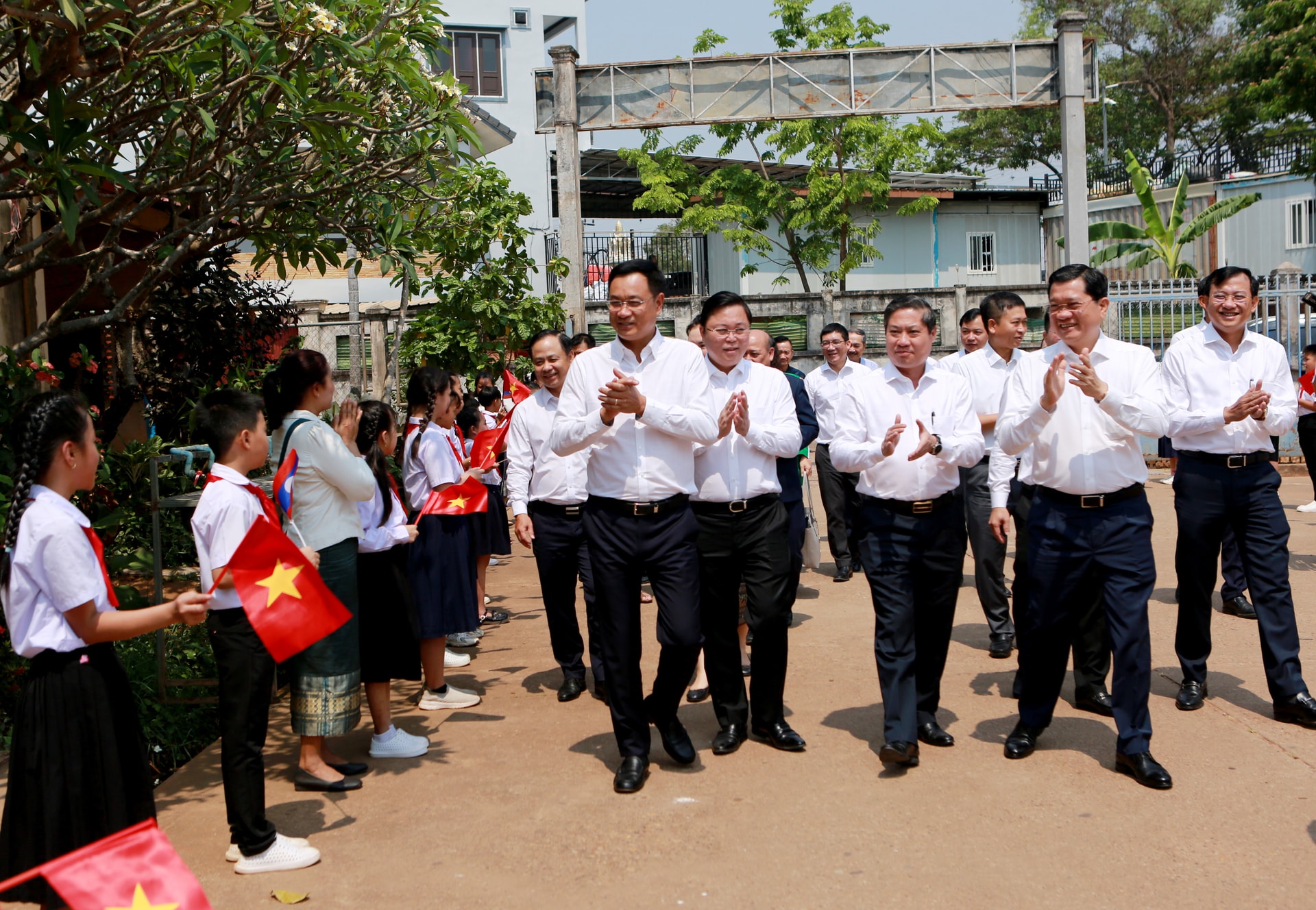 Bí thư Thành ủy Lê Ngọc Quang (hàng đầu, bên trái) cùng đoàn đại biểu thăm Trường Hữu nghị tại Champasak. Ảnh: T.CÔNG