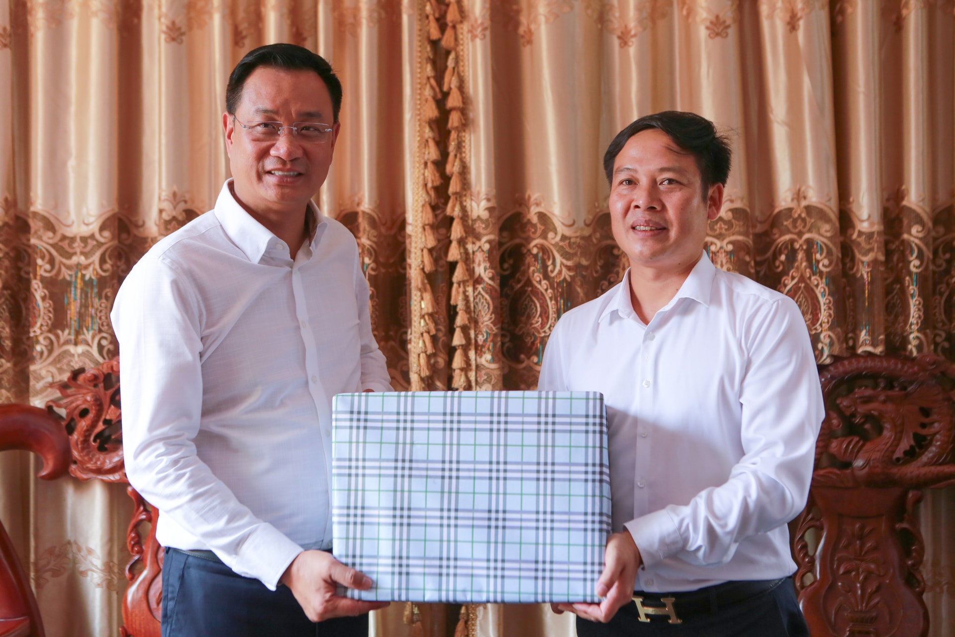 Bí thư Thành ủy Lê Ngọc Quang tặng quà cho Văn phòng đại diện Sở Công thương Đà Nẵng tại Nam Lào. Ảnh: T.CÔNG