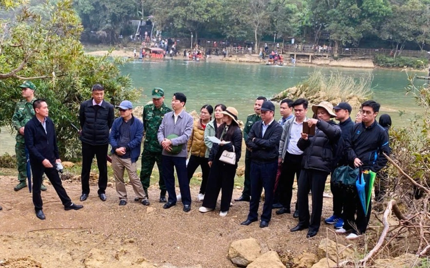 Đoàn công tác liên Bộ và các sở, ngành khảo sát thực địa khu vực mốc 836(2) tại Khu du lịch thác Bản Giốc, xã Đàm Thủy.