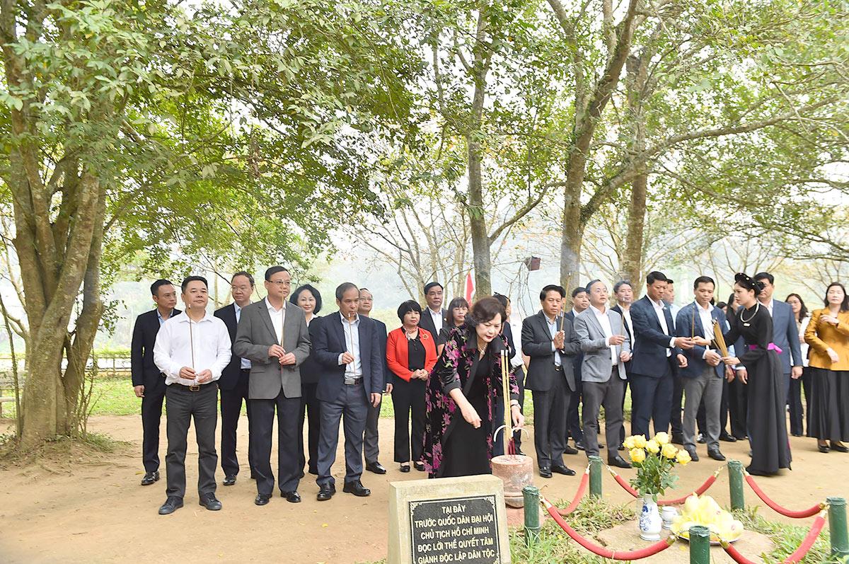 Các đại biểu dâng hoa tại đình Tân Trào.