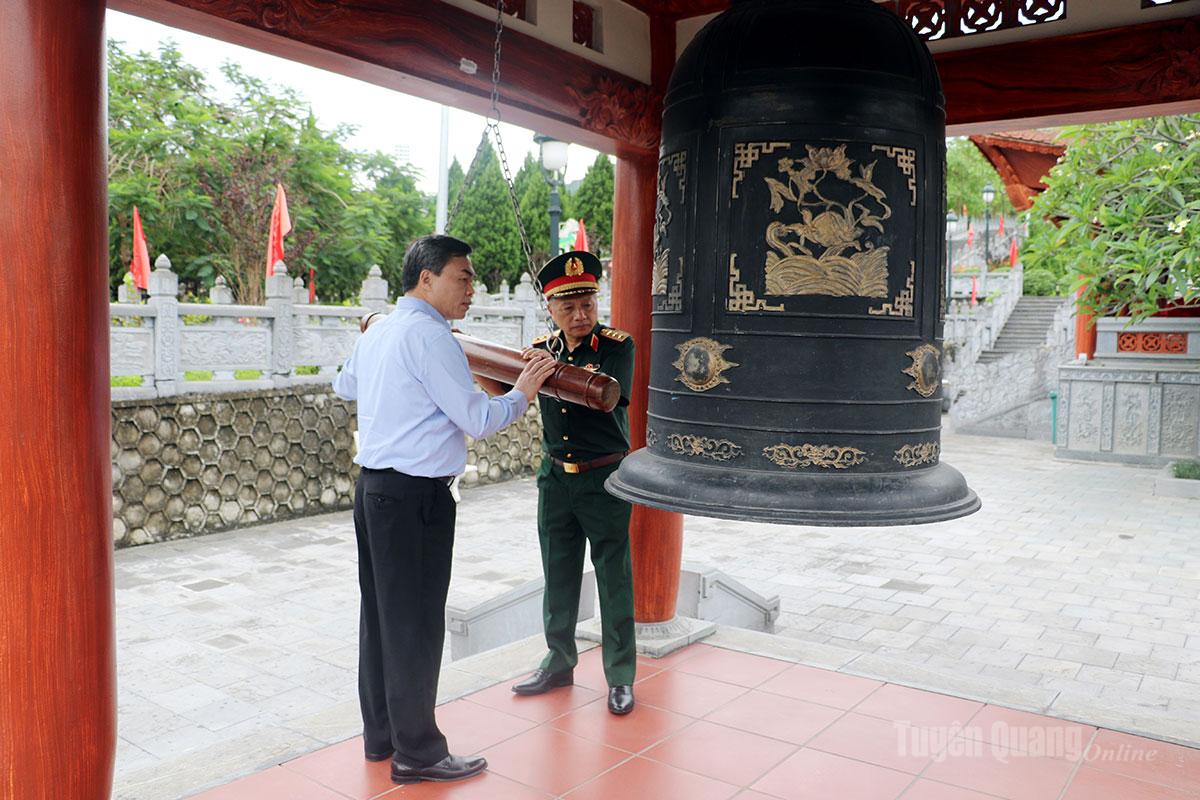 Thượng tướng Lê Quang Minh, Phó Chủ nhiệm Tổng cục chính trị Quân đội Nhân dân Việt Nam và đồng chí Ma Thế Hồng, Phó Bí thư Tỉnh ủy, Chủ tịch Ủy ban MTTQ tỉnh thỉnh chuông tại Nghĩa trang Liệt sĩ Quốc gia Vị Xuyên.