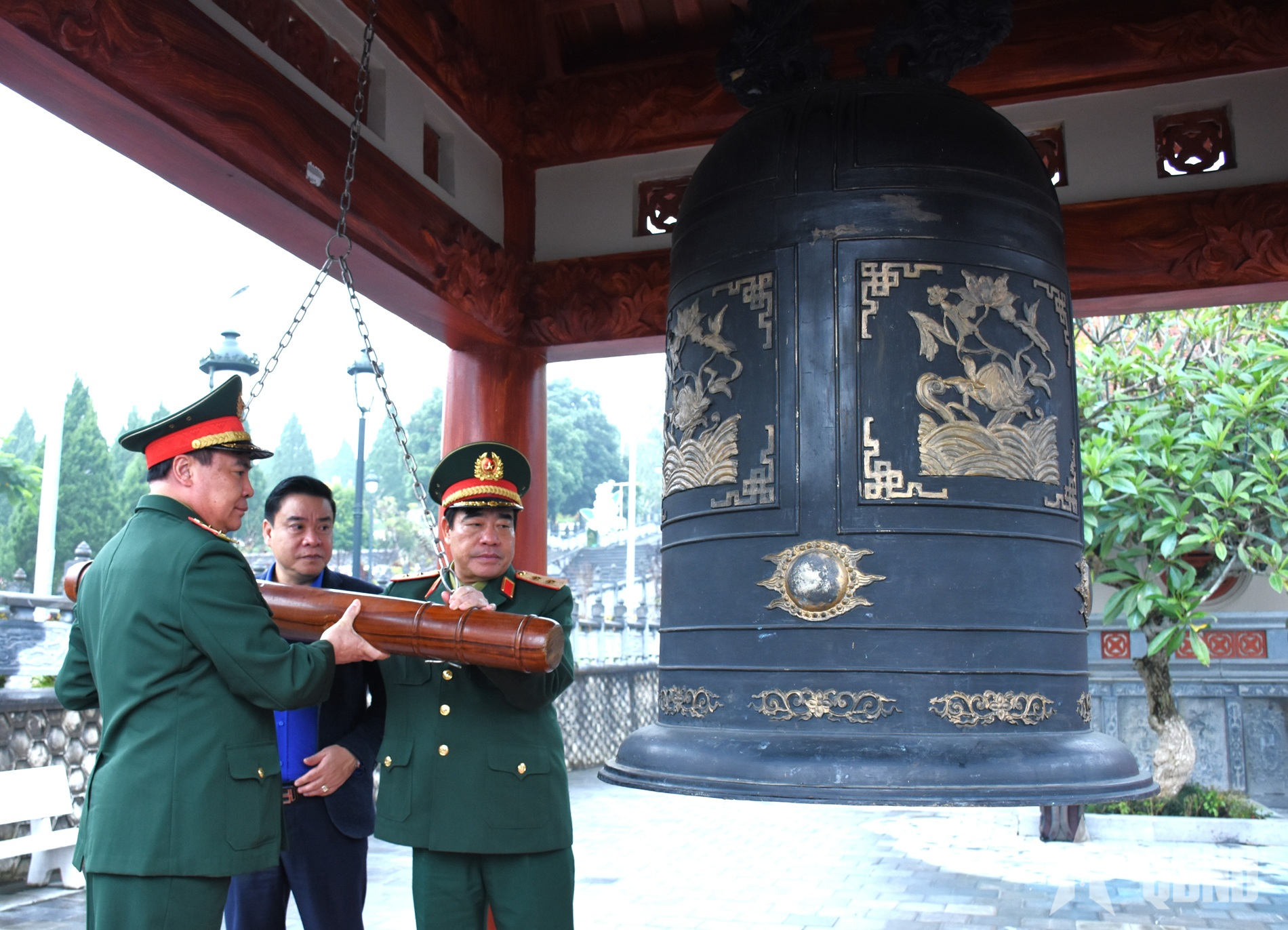 Trung tướng Nguyễn Bá Lực và các đại biểu thỉnh chuông tại Nghĩa trang Liệt sĩ Quốc gia Vị Xuyên.