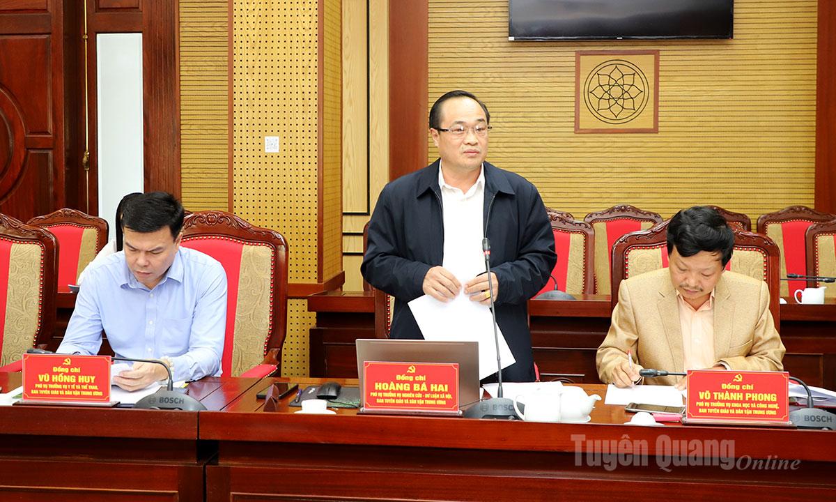 Dự buổi làm việc về phía tỉnh Tuyên Quang có các đồng chí: Lê Thị Kim Dung, Phó Bí thư Thường trực Tỉnh ủy; Trần Mạnh Lợi, Ủy viên Ban Thường vụ Tỉnh ủy, Trưởng Ban Tuyên giáo và Dân vận Tỉnh ủy; Hà Trung Kiên, Ủy viên Ban Thường vụ Tỉnh ủy, Phó Chủ tịch Thường trực Ủy ban MTTQ tỉnh; lãnh đạo các Ban Xây dựng Đảng Tỉnh ủy; lãnh đạo các sở, ban, ngành.