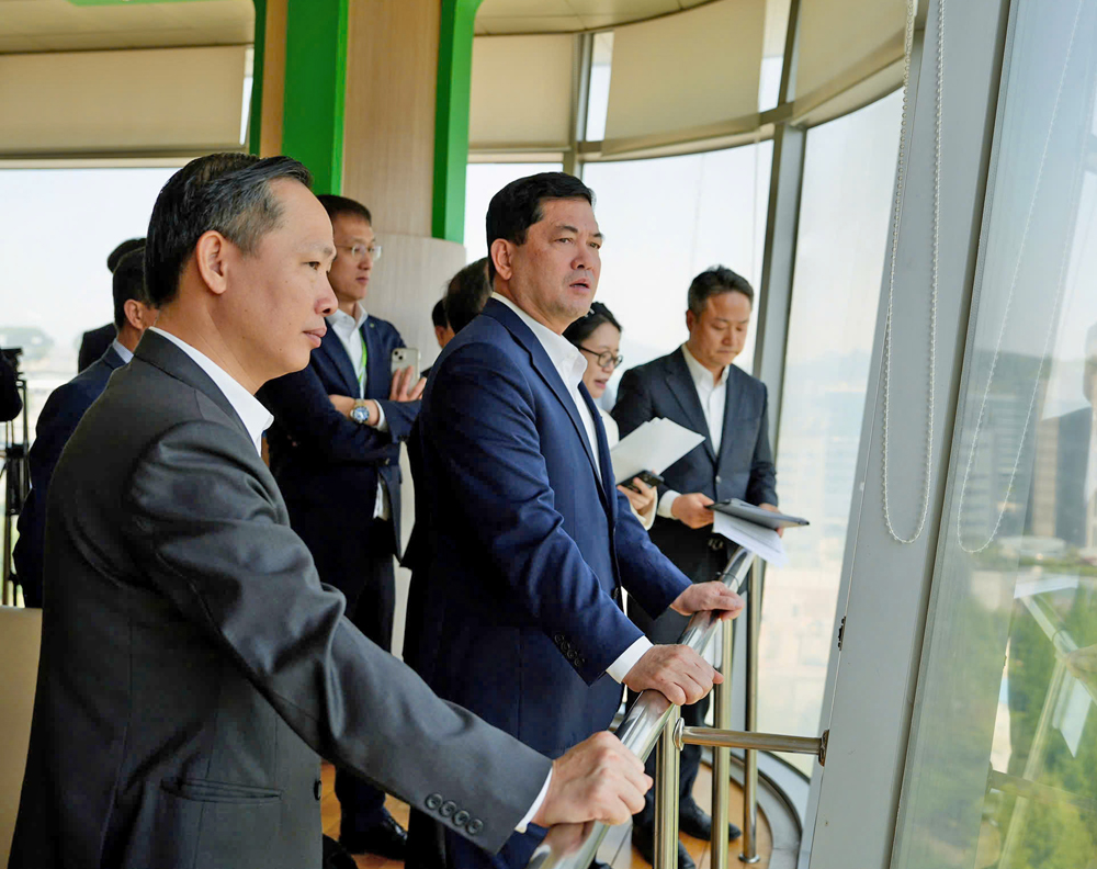 Đồng chí Nguyễn Hồng Thái và các thành viên Đoàn công tác tỉnh Bắc Ninh tại khu quan sát của ống khói Công trình Pangyo Clean Tower, thành phố Seongnam (Hàn Quốc) - công trình xử lý rác thải hiện đại, thân thiện môi trường.