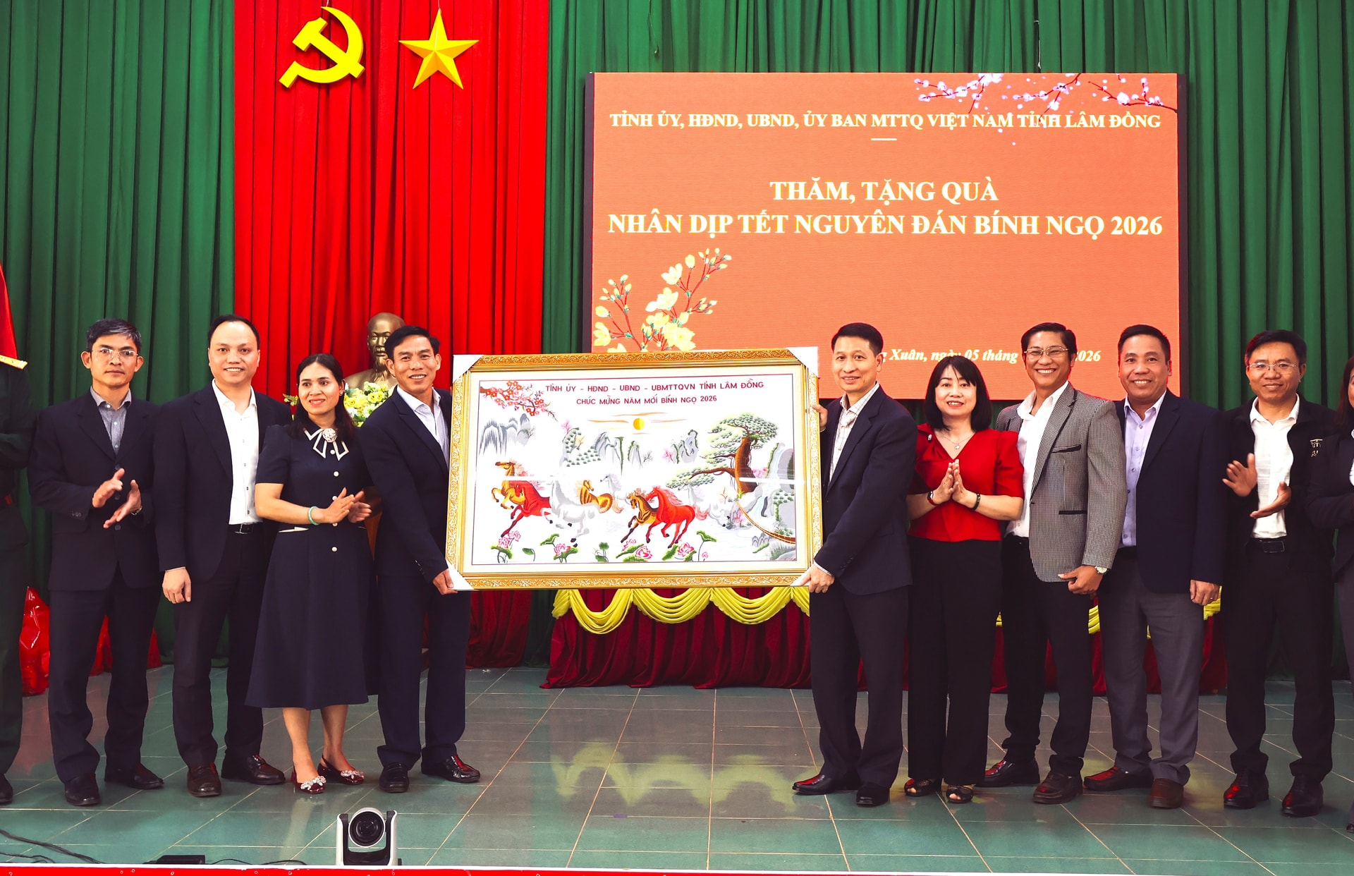 Đồng chí Bùi Huy Thành tặng tranh thêu "Mã đáo thành công" chúc mừng Đảng bộ, chính quyền xã Trường Xuân nhân dịp Tết Nguyên đán Bính Ngọ 2026
