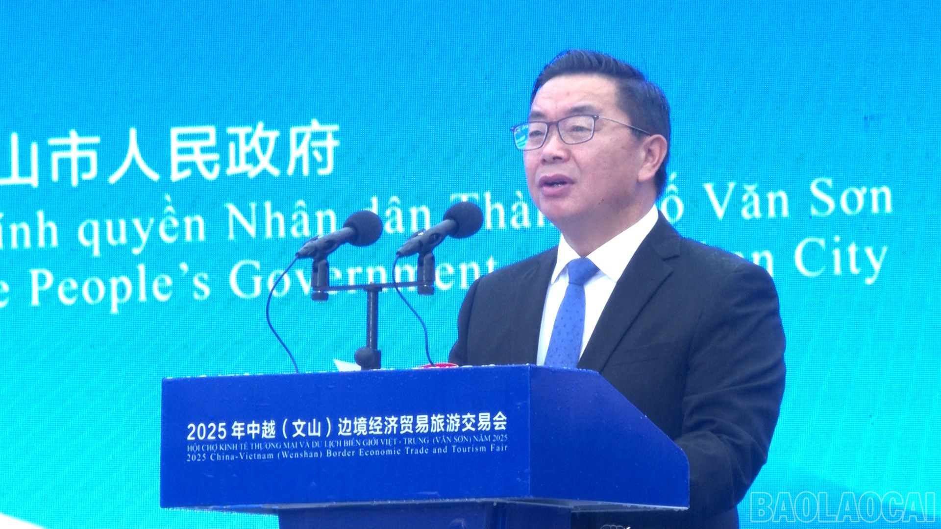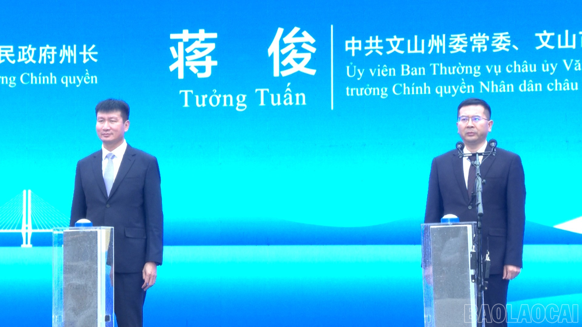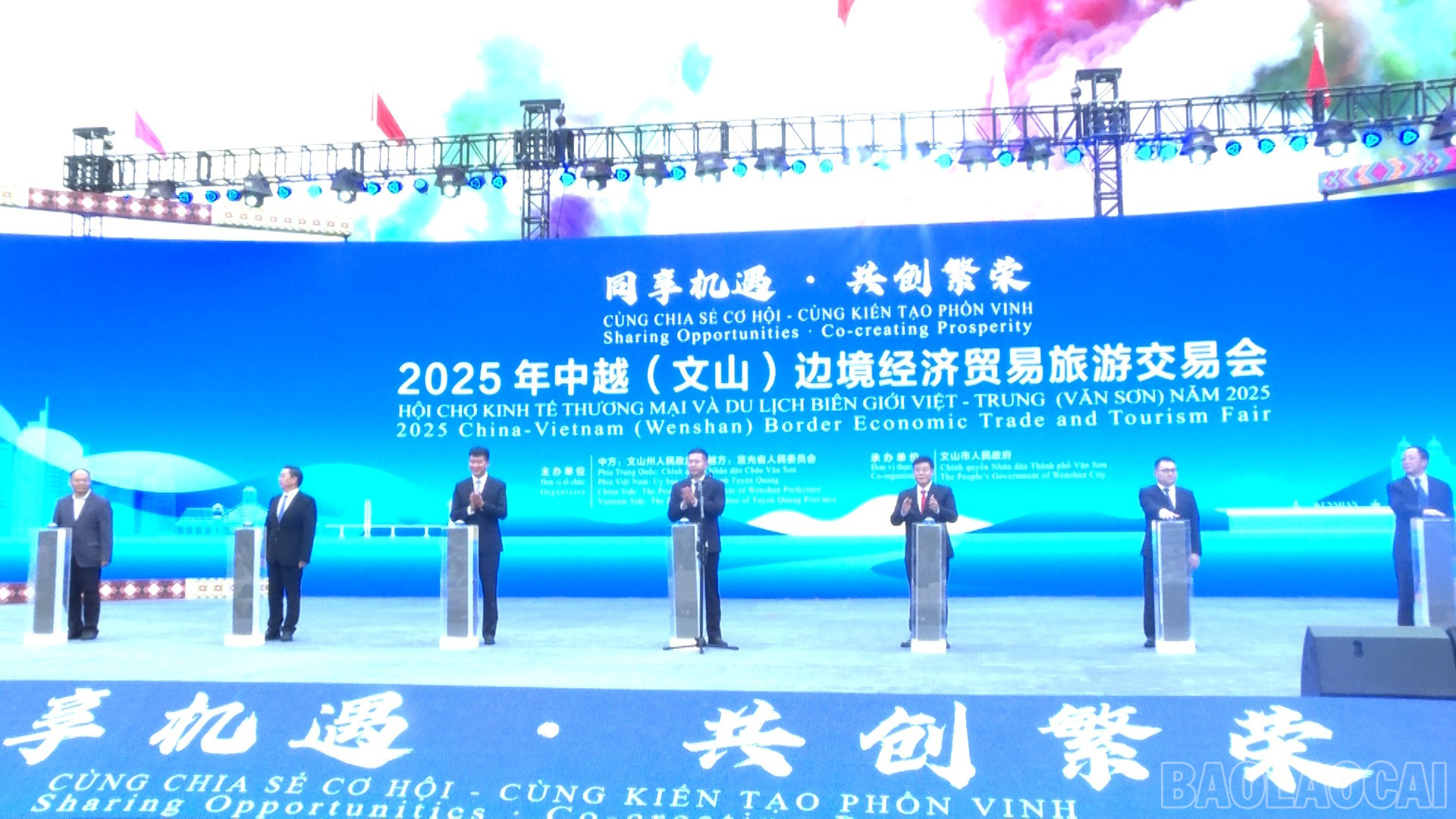 Đồng chí Trần Huy Tuấn - Phó Bí thư Tỉnh ủy, Chủ tịch UBND tỉnh Lào Cai và ông Triệu Quốc Lương - Bí thư Châu ủy châu Văn Sơn cùng lãnh đạo các địa phương của Việt Nam và Trung Quốc đã ấn nút khai mạc Hội chợ Kinh tế - Thương mại - Du lịch Biên giới Việt – Trung (Văn Sơn) năm 2025.