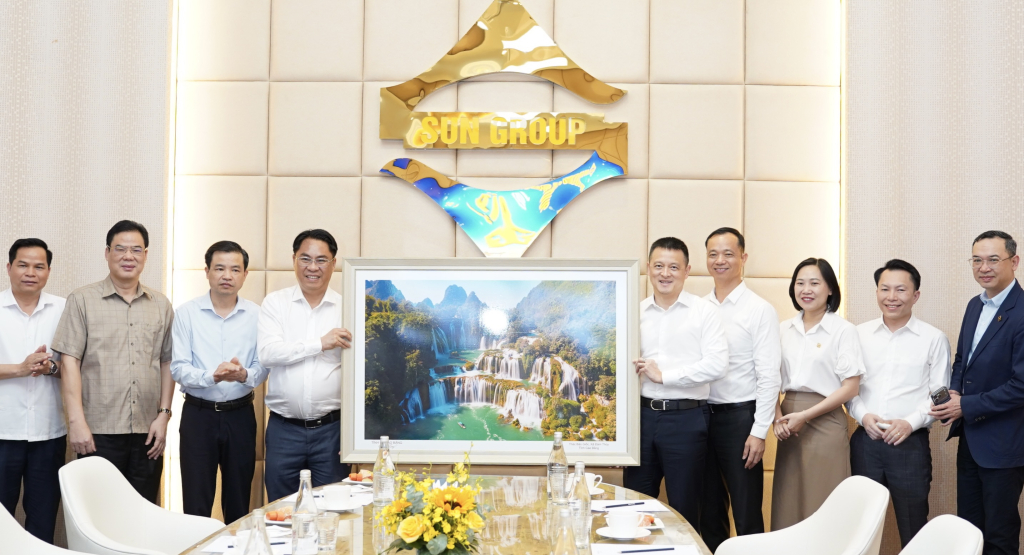 Đoàn công tác của tỉnh trao quà lưu niệm cho đại diện Tập đoàn Sun Group.