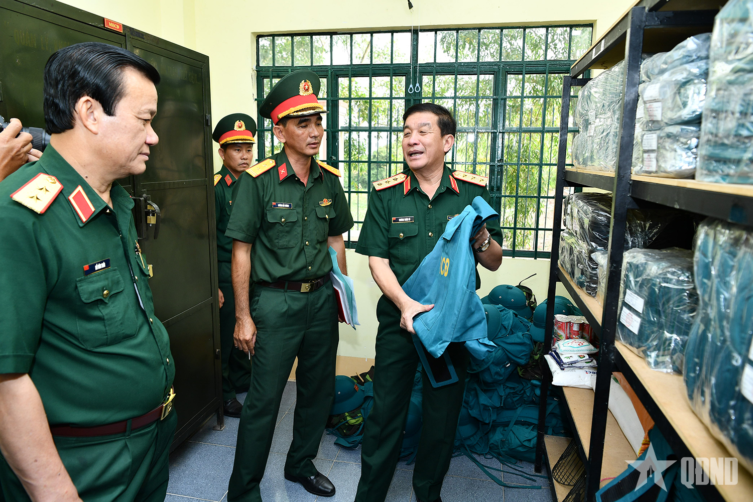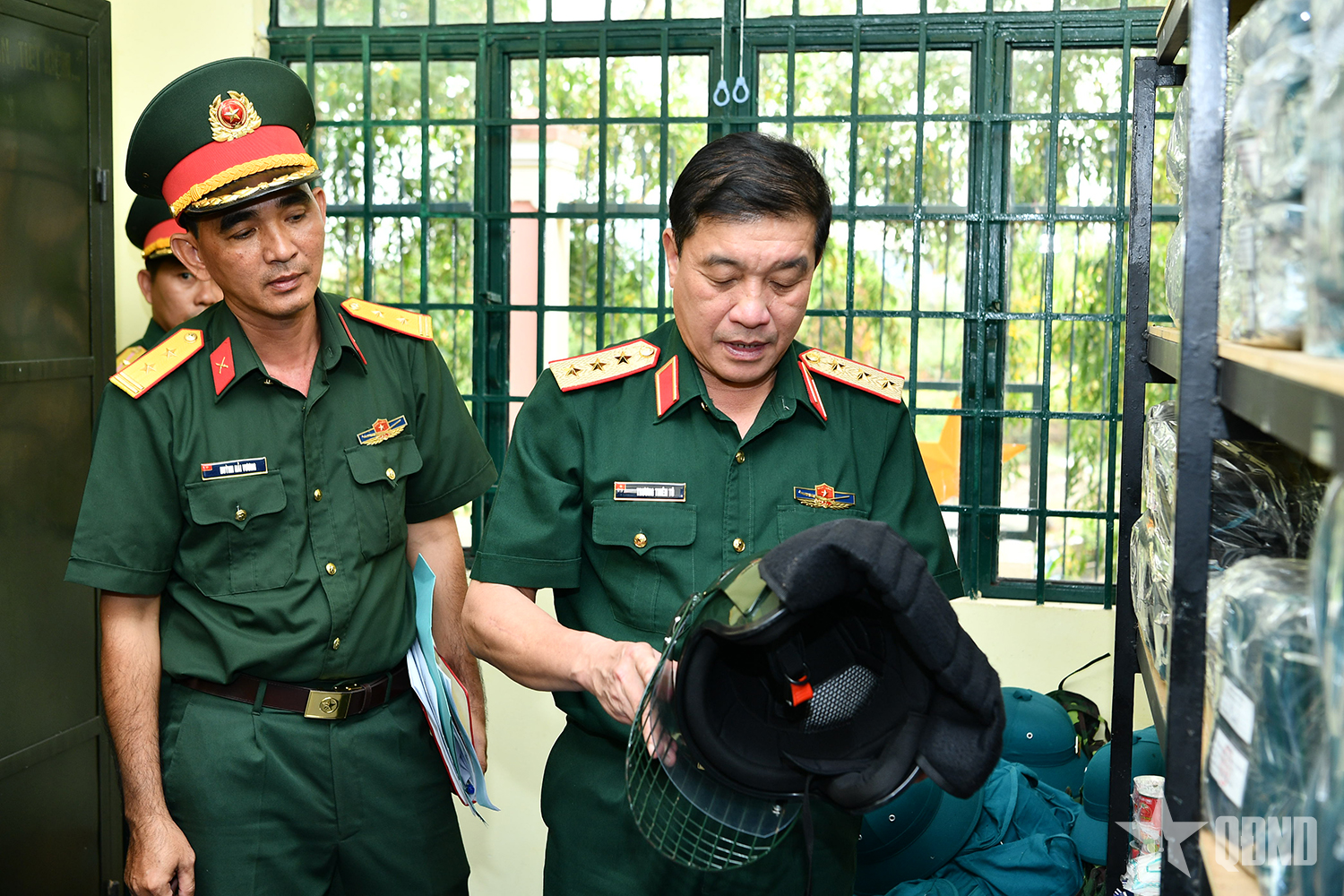 Thượng tướng Trương Thiên Tô kiểm tra vật chất sẵn sàng chiến đấu tại Ban CHQS phường Vĩnh Tế.