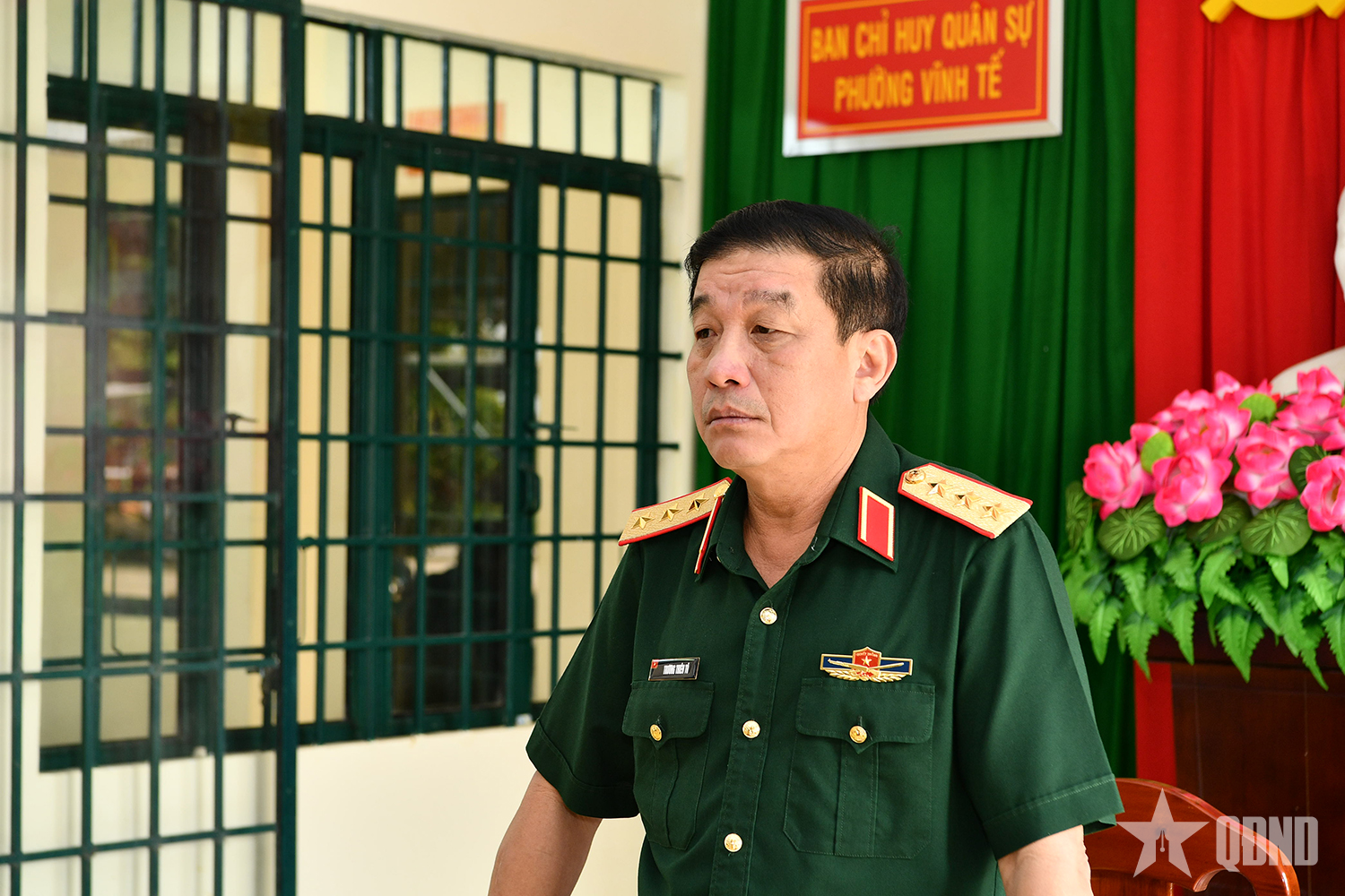 Thượng tướng Trương Thiên Tô phát biểu tại buổi kiểm tra Ban CHQS phường Vĩnh Tế.