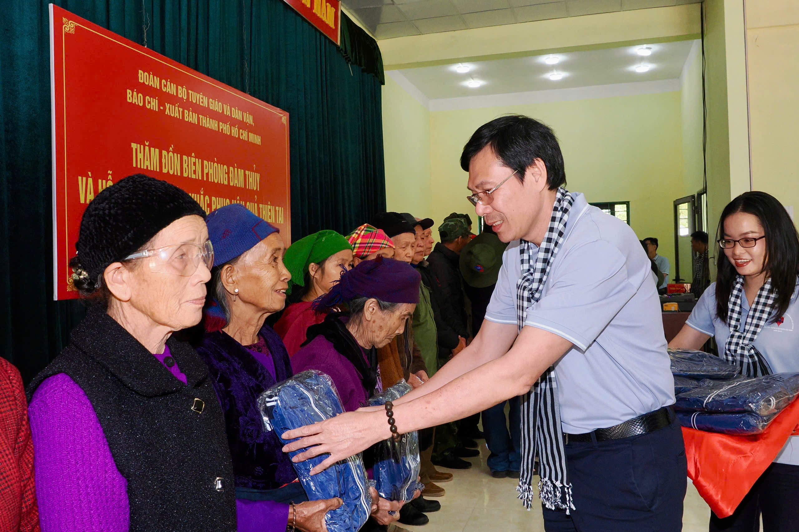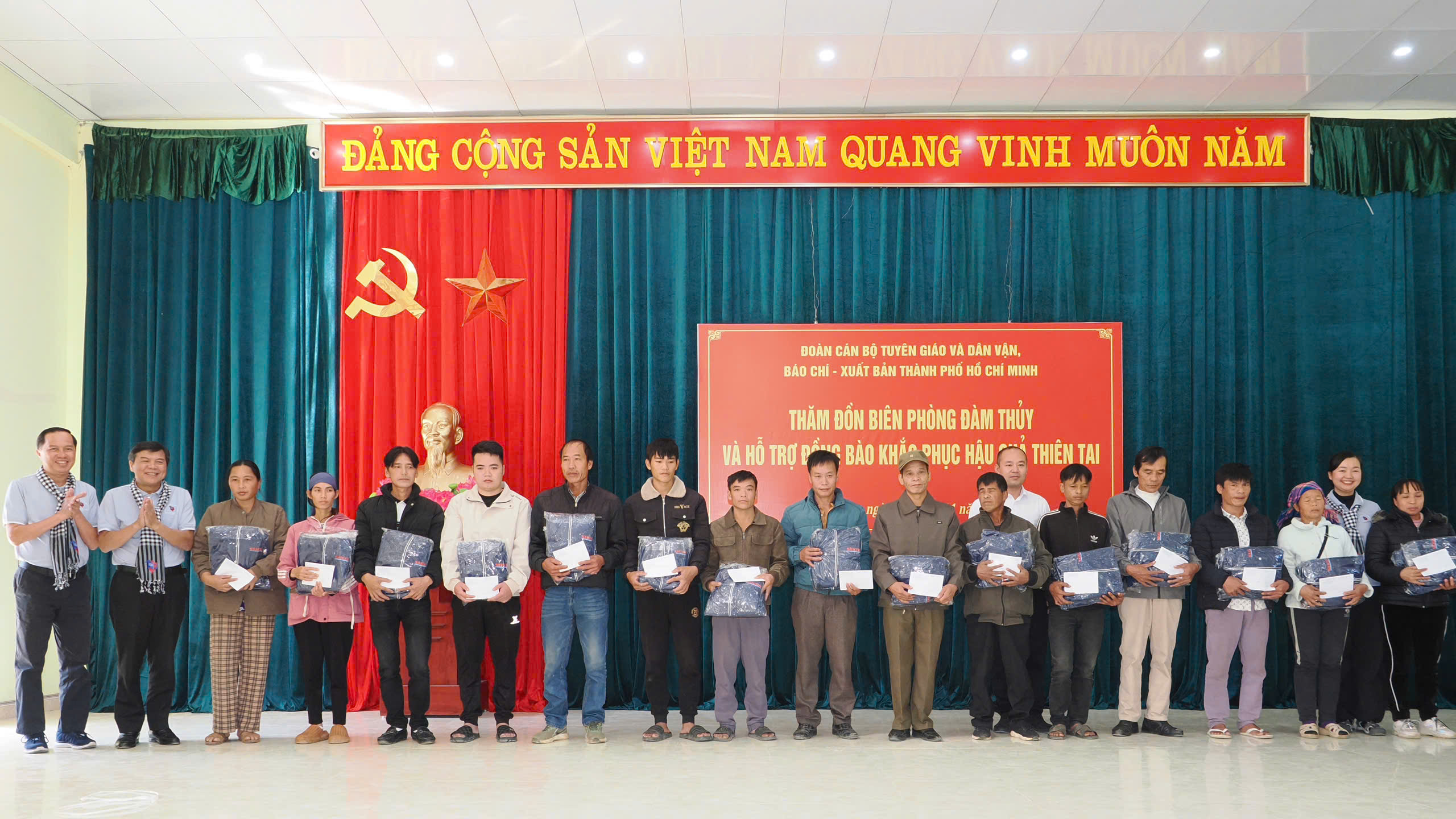 Dịp này, Đoàn công tác TPHCM đã trao tặng Đồn Biên phòng Đàm Thủy và người dân 2 địa phương 500 lá cờ Tổ quốc, tặng 100 áo ấm, 1 tủ sách không gian văn hóa Bác Hồ. Ngoài ra, đoàn cũng trao 50 suất học bổng cho học sinh nghèo, có hoàn cảnh đặc biệt khó khăn, 30 suất hỗ trợ gia đình chính sách, gia đình có hoàn cảnh khó khăn và 20 suất quà tặng cho hộ gia đình khó khăn chịu ảnh hưởng do bão lũ. Tổng giá trị đợt trao quà hơn 220 triệu đồng.